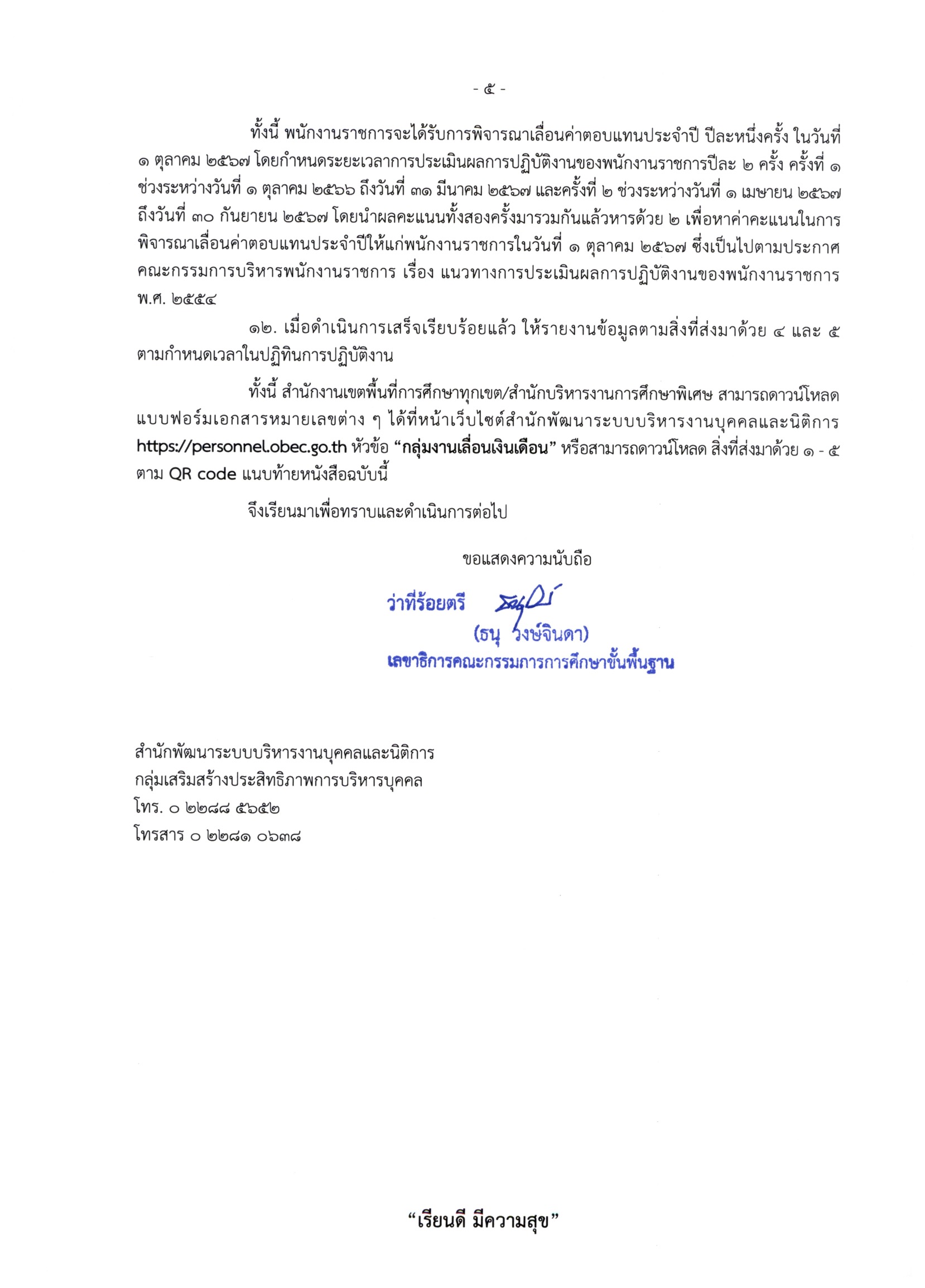 ทั้งนี้ สำนักงานเขตพื้นที่การศึกษาทุกเขต/สำนักบริหารงานการศึกษาพิเศษ สามารถดาวน์โหลดแบบฟอร์มเอกสารหมายเลขต่าง ๆ ได้ที่หน้าเว็บไซต์สำนักพัฒนาระบบบริหารงานบุคคลและนิติการ https://personnel.obec.go.th หัวข้อ “กลุ่มงานเลื่อนเงินเดือน” หรือสามารถดาวน์โหลด สิ่งที่ส่งมาด้วย 1 - 5 ตาม QR code แนบท้ายหนังสือฉบับนี้