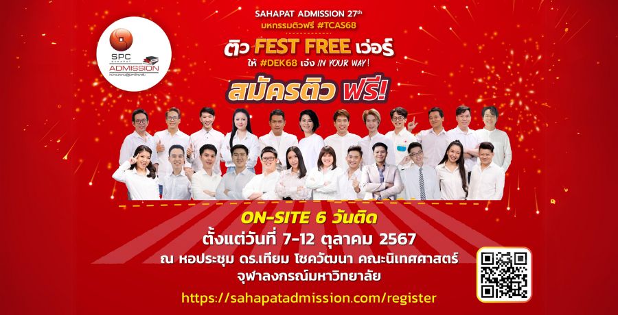“สหพัฒน์แอดมิชชั่น” ครั้งที่ 27 ติวเดียวแห่งปี ที่เนื้อหาเข้มข้น เน้นทั้ง “วิชาการ” และ “ความสนุกสนาน” ที่ปีนี้มาด้วยแนวคิด “Sahapat Admission ครั้งที่ 27 “ติว FEST FREE เว่อร์”ให้ #DEK68 เจ๋ง IN YOUR WAY! โอกาสเดียวของ DEK68 ที่จะได้ติวเข้มข้นกับติวเตอร์ชั้นนำแบบตัวเป็นๆ โดยการจัดติวสด 6 วันติด ติว 12 วิชากับ 24 ติวเตอร์แถวหน้าของประเทศไทย ระหว่างวันที่ 7-12 ตุลาคม 2567 เวลา 09.00-16.00 น. ณ หอประชุม ดร.เทียม โชควัฒนา คณะนิเทศศาสตร์ จุฬาลงกรณ์มหาวิทยาลัย พร้อมทั้งถ่ายทอดสัญญาณทาง www.sahapatadmission.com
