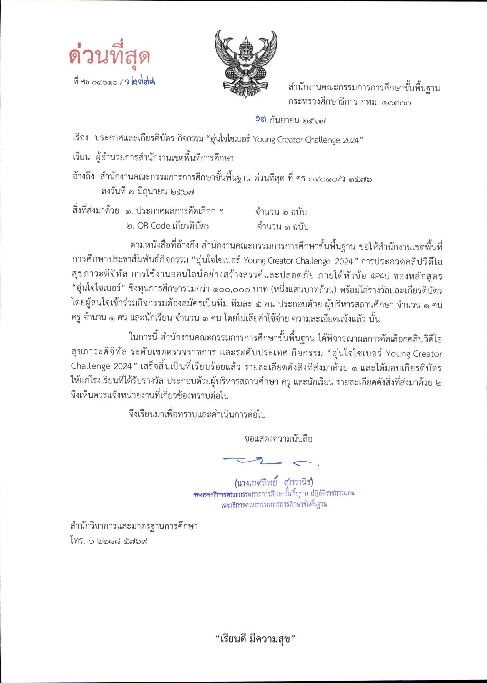 ประกาศและเกียรติบัตร กิจกรรม "อุ่นใจไซเบอร์ Young Creator Challenge 2024"ประกาศและเกียรติบัตรกิจกรรมอุ่นใจไซเบอร์YoungCreatorChallenge2024