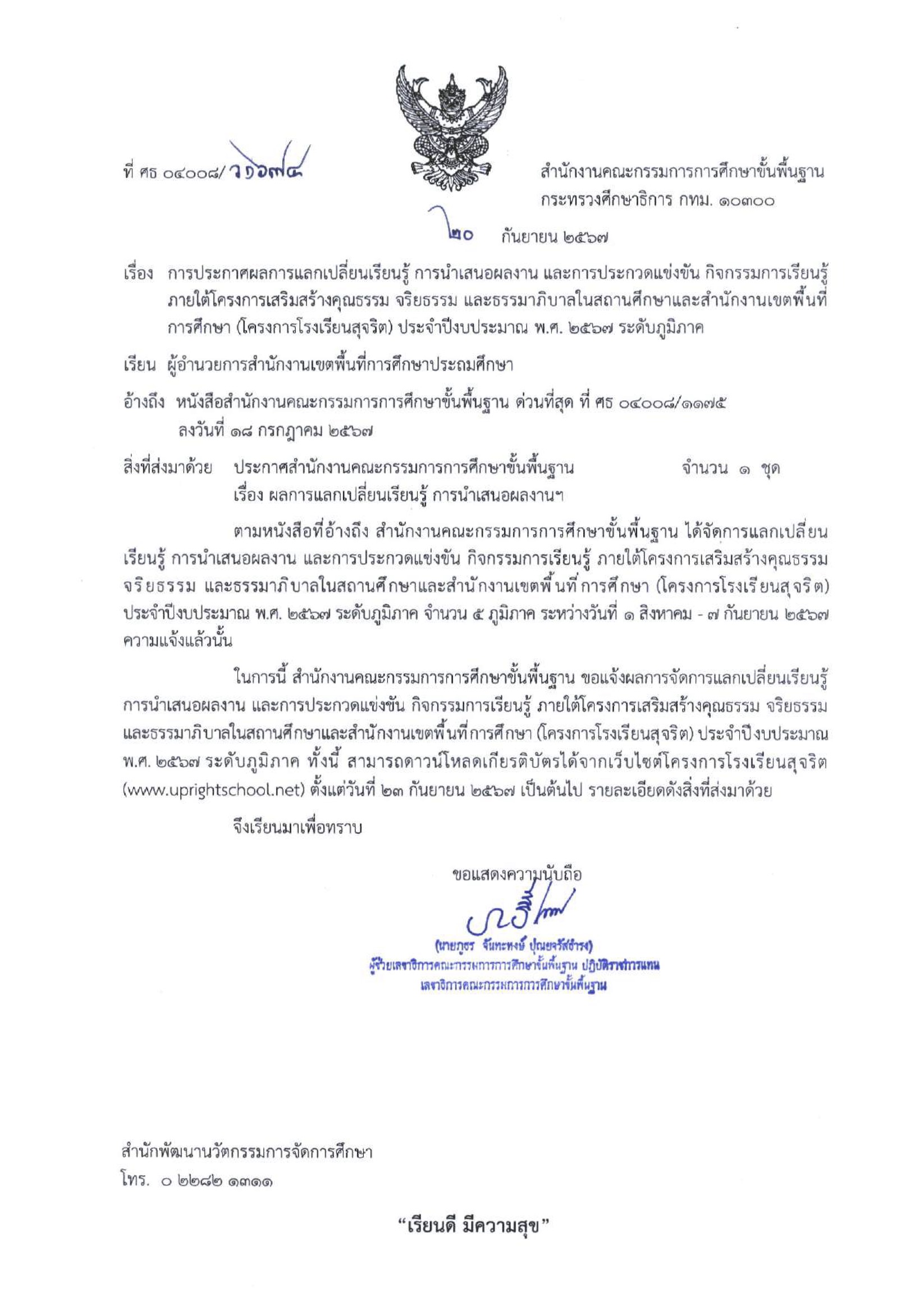 การประกาศผลการแลกเปลี่ยนเรียนรู้ การนำเสนอผลงาน และการประกวดแข่งขัน กิจกรรมการเรียนรู้ภายใต้โครงการเสริมสร้างคุณธรรม จริยธรรม และธรรมาภิบาลในสถานศึกษา