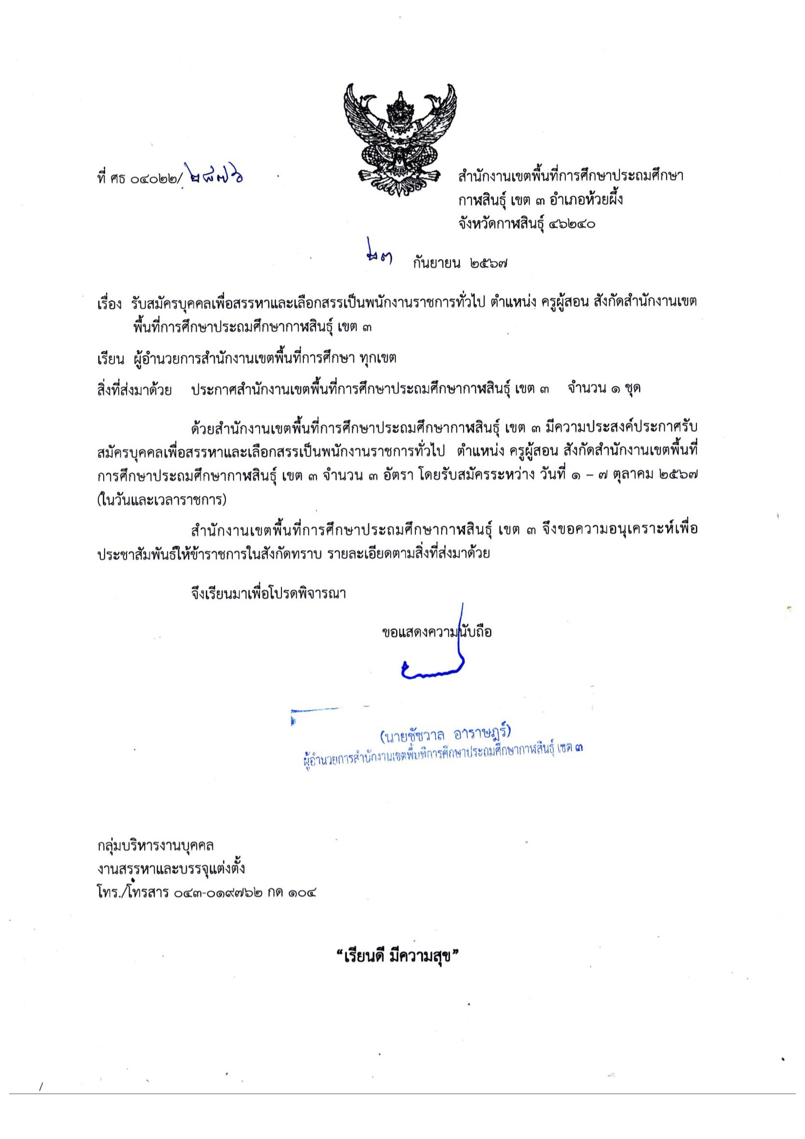 สำนักงานเขตพื้นที่การศึกษาประถมศึกษากาฬสินธุ์ เขต 3 มีความประสงค์ประกาศรับ สมัครบุคคลเพื่อสรรหาและเลือกสรรเป็นพนักงานราชการทั่วไป ตำแหน่ง ครูผู้สอน สังกัดสำนักงานเขตพื้นที่ การศึกษาประถมศึกษากาฬสินธุ์ เขต 3