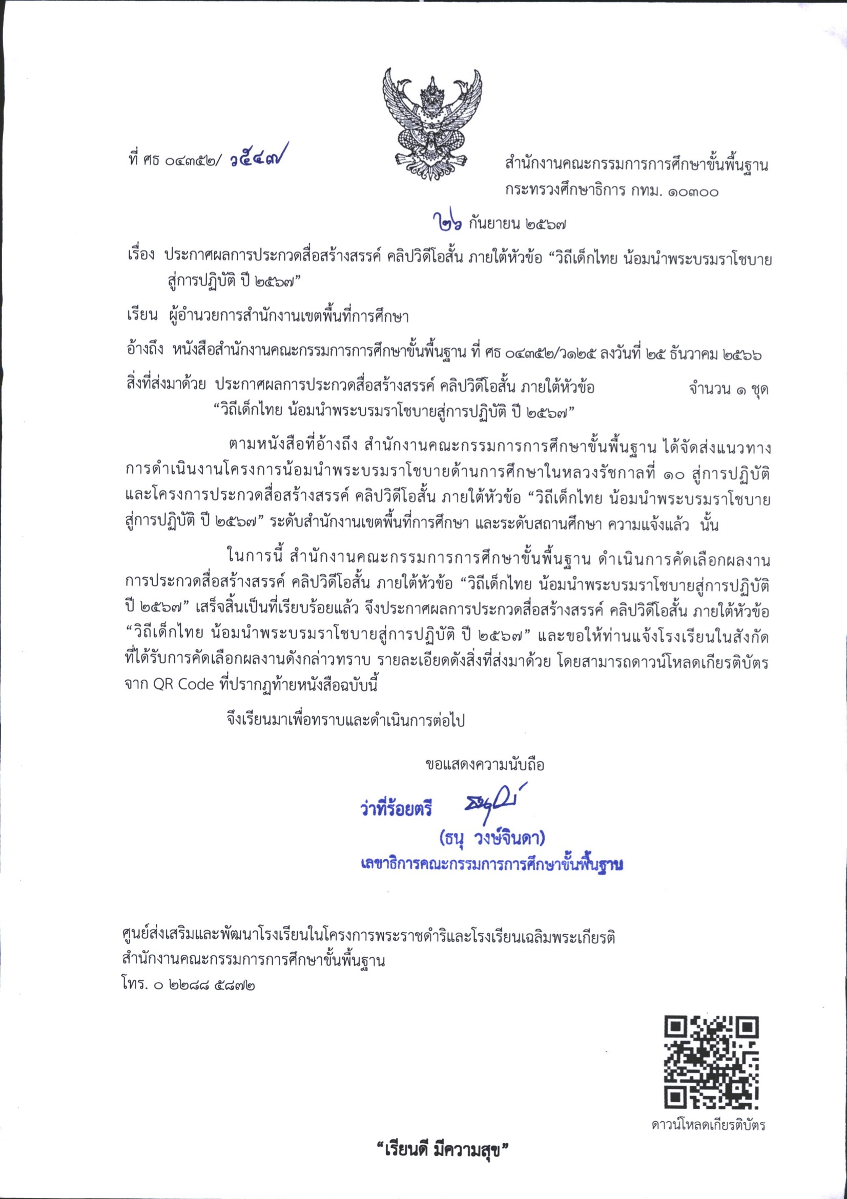 ประกาศผลการประกวดสื่อสร้างสรรค์ คลิปวิดีโอสั้น ภายใต้หัวข้อ "วิถีเด็กไทย น้อมนำพระบรมราโชบายสู่การปฏิบัติ ปี 2567"