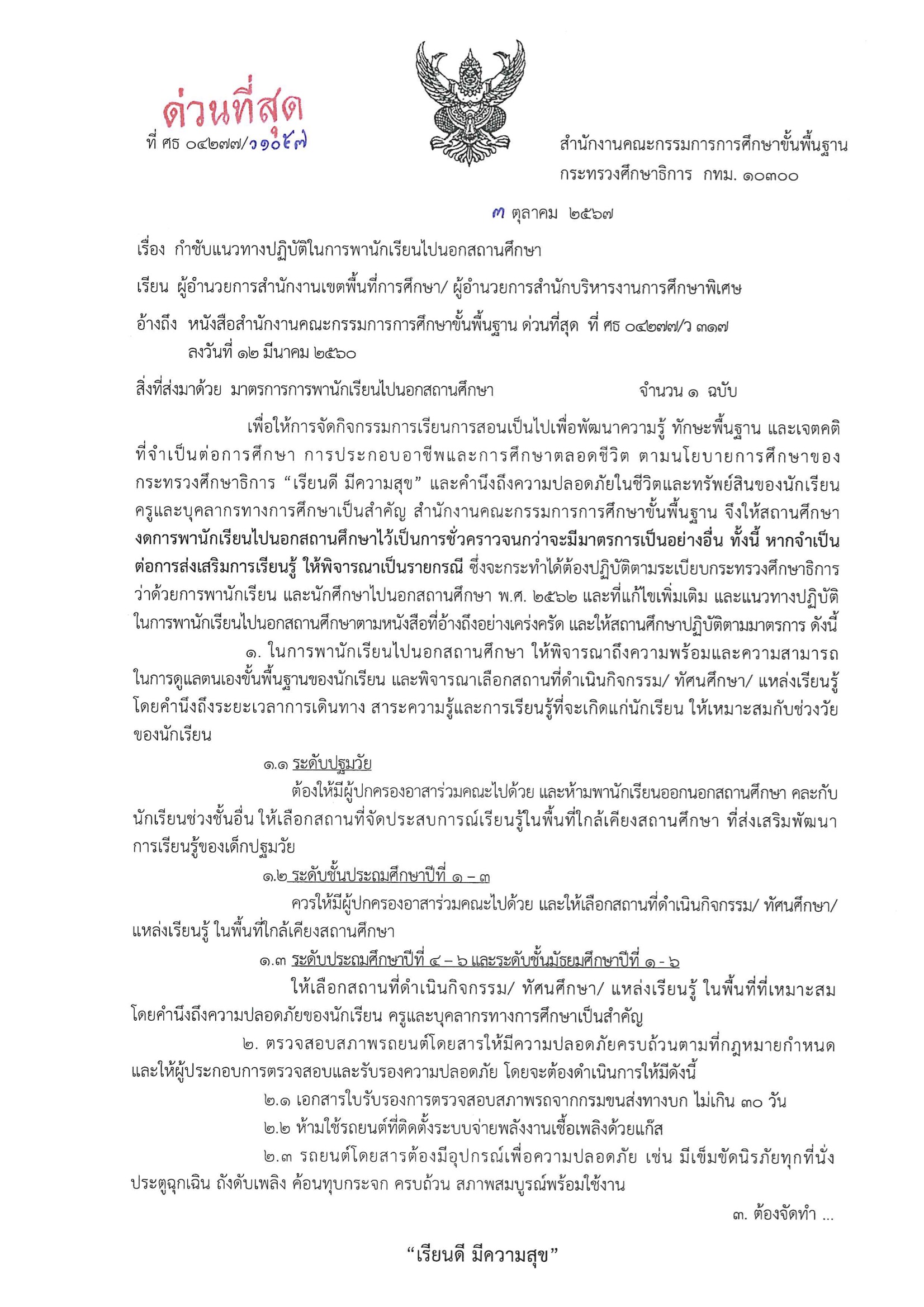 สำนักงานคณะกรรมการการศึกษาขั้นพื้นฐาน มีหนังสือ ที่ ศธ 04277/ว1057 ลงวันที่ 3 ตุลาคม 2567 เรื่อง กำชับแนวทางปฎิบัติในการพานักเรียนไปนอกสถานศึกษา