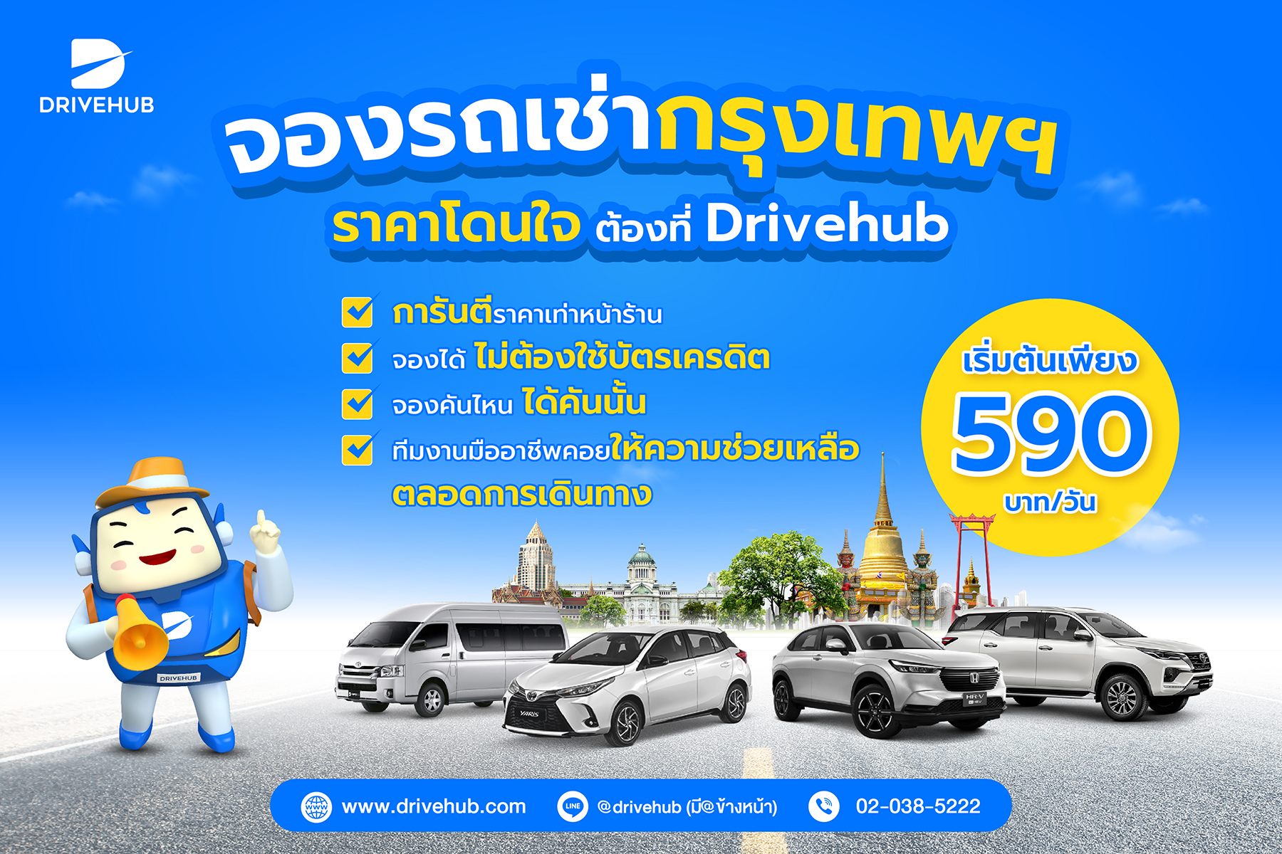 ขับรถเที่ยวใกล้กรุงเทพฯ ได้สะดวกสบายมากกว่าเคย แค่เช่ารถกรุงเทพฯ จาก Drivehub แอปฯ รวมรถเช่ากรุงเทพฯ และรถเช่าทั่วไทยได้มาตรฐาน คัดสรรคุณภาพ มั่นใจได้ทุกคัน จองคันไหนได้คันนั้น การันตีราคาเท่าหน้าร้าน ไม่บวกเพิ่ม มีรถให้เลือกหลากหลายขนาด ตอบโจทย์ทุกรูปแบบการเดินทาง ไม่ว่าจะแก๊งค์เล็ก แก๊งค์ใหญ่ ก็พร้อมให้บริการ อุ่นใจตลอดการเดินทาง ด้วยทีมงานคอยให้ความช่วยเหลือตลอดทริป ให้การเดินทางของคุณปลอดภัย ไม่มีสะดุด พร้อมรับส่วนลดจากแบรนด์ชื่อดังมากมาย จองเลย เริ่มต้นเพียง 590 บาท / วัน