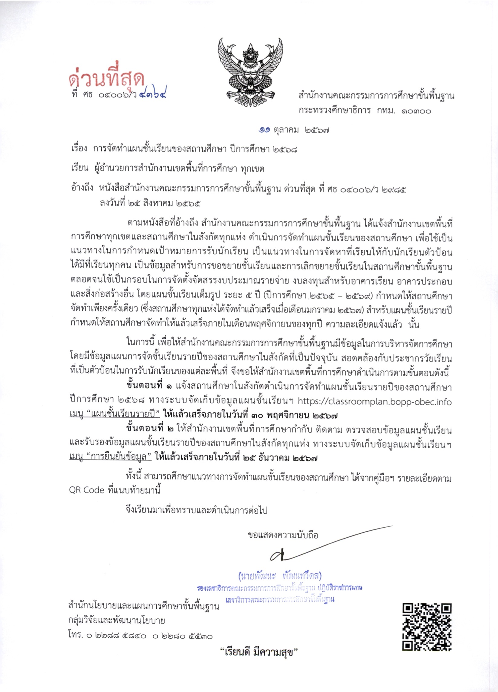 ตามหนังสือที่อ้างถึง สำนักงานคณะกรรมการการศึกษาขั้นพื้นฐาน ได้แจ้งสำนักงานเขตพื้นที่การศึกษาทุกเขตและสถานศึกษาในสังกัดทุกแห่ง ดำเนินการจัดทำแผนชั้นเรียนของสถานศึกษา เพื่อใช้เป็นแนวทางในการกำหนดเป้าหมายการรับนักเรียน เป็นแนวทางในการจัดหาที่เรียนให้กับนักเรียนตัวป้อนได้มีที่เรียนทุกคน เป็นข้อมูลสำหรับการขอขยายชั้นเรียนและการเลิกขยายชั้นเรียนในสถานศึกษาขั้นพื้นฐา นตลอดจนใช้เป็นกรอบในการจัดตั้งจัดสรรงบประมาณรายจ่าย งบลงทุนสำหรับอาคารเรียน อาคารประกอบ และสิ่งก่อสร้างอื่น โดยแผนชั้นเรียนเต็มรูป ระยะ ๕ ปี (ปีการศึกษา๒๕๖๕ -๒๕๖๙) กำหนดให้สถานศึกษา จัดทำเพียงครั้งเดียว (ซึ่งสถานศึกษาทุกแห่งได้จัดทำแล้วเสร็จเมื่อเดือนมกราคม ๒๕๖๗) สำหรับแผนชั้นเรียนรายปีกำหนดให้สถานศึกษาจัดทำให้แล้วเสร็จภายในเดือนพฤศจิกายนของทุกปี ความละเอียดแจ้งแล้ว นั้น