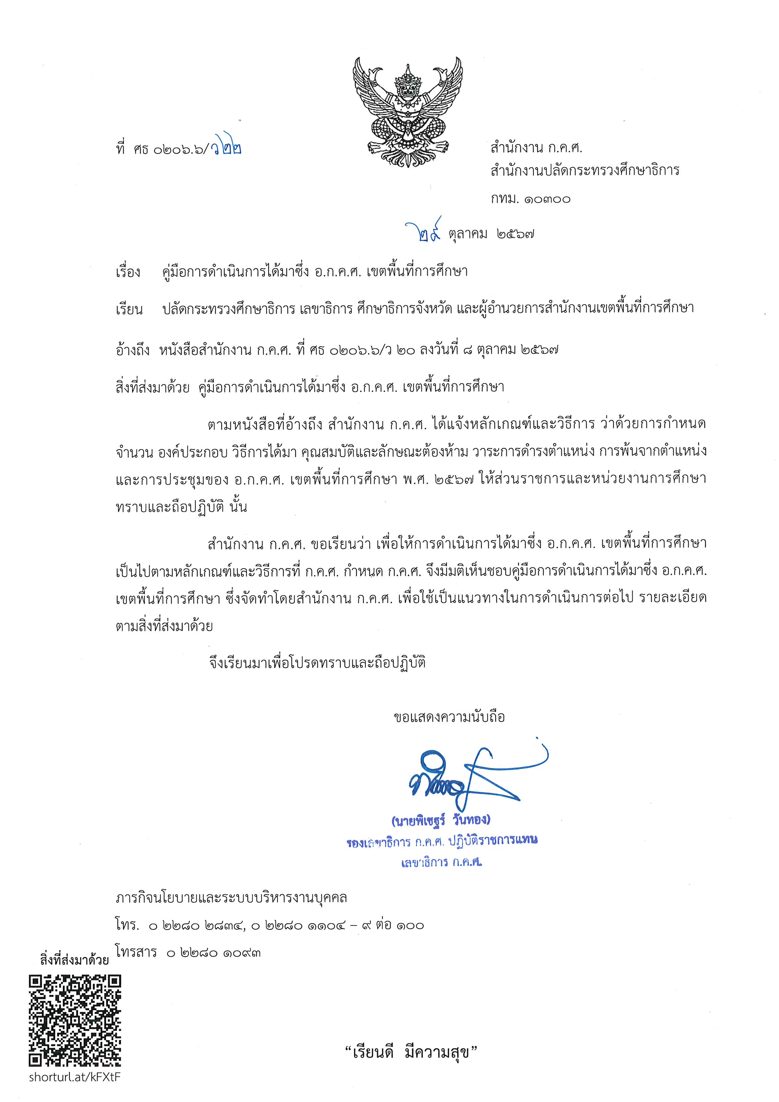 ว 22/2567 คู่มือการดำเนินการได้มาซึ่ง อ.ก.ค.ศ. เขตพื้นที่การศึกษา