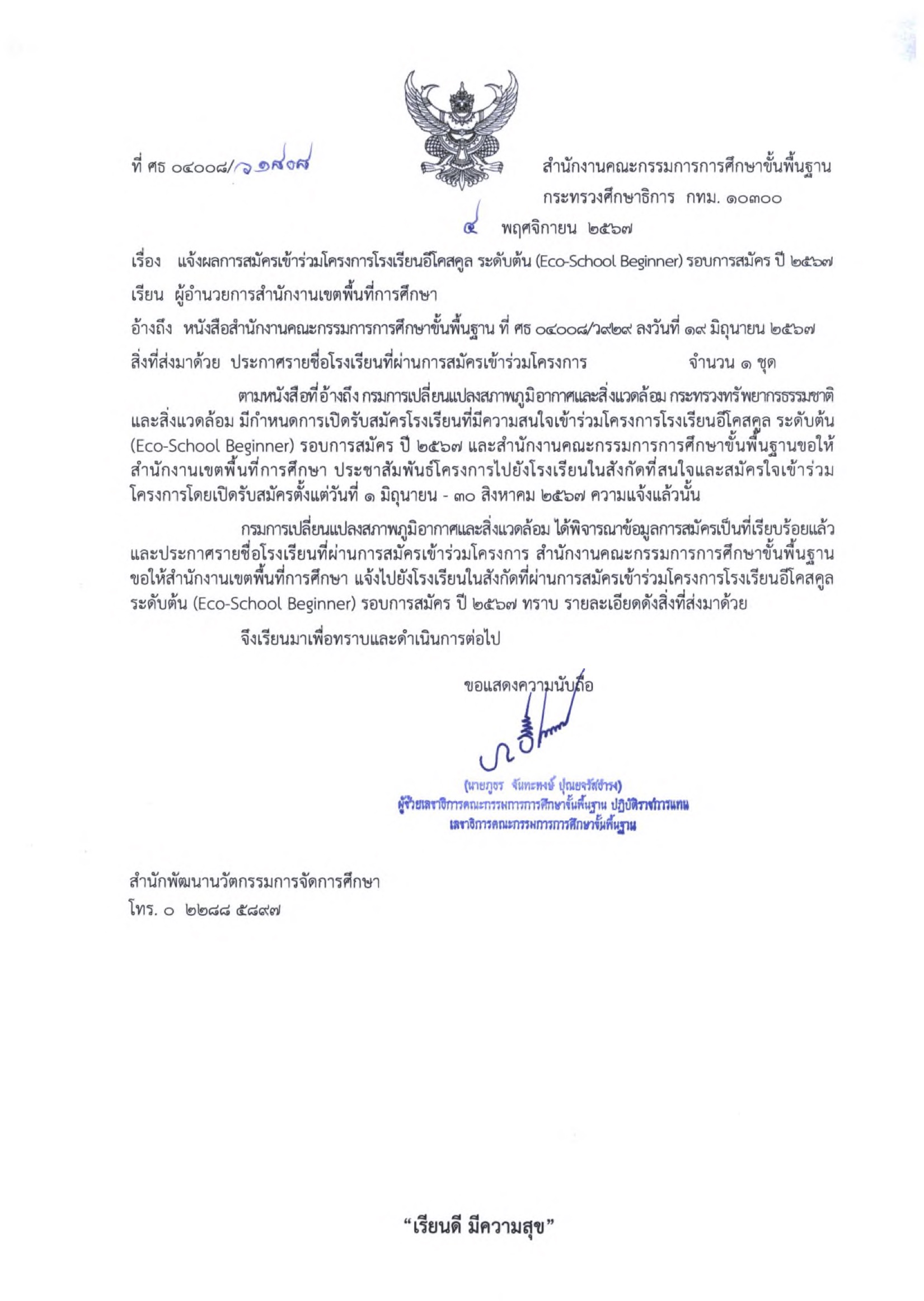 สพฐ.แจ้งผลการสมัครเข้าร่วมโครงการโรงเรียนอีโคสคูล ระดับต้น (Eco-School Beginner) รอบการสมัครปี 2567