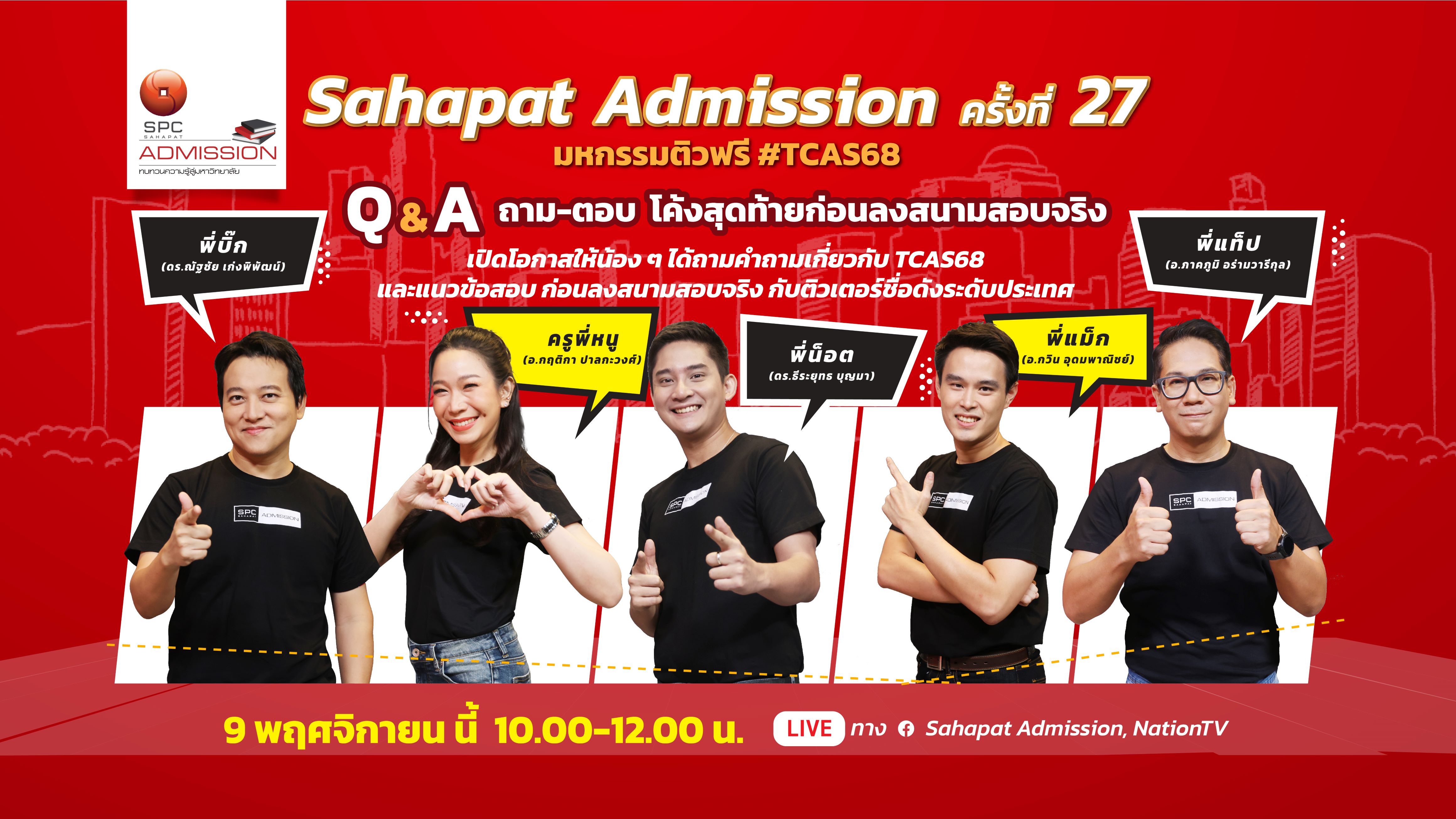 “สหพัฒน์แอดมิชชั่น” ครั้งที่ 27 ส่งท้าย DEK68 ก่อนเข้าสู่สนามสอบจริงปลายปีนี้ ด้วยกิจกรรม “Q&A ถาม-ตอบโค้งสุดท้ายก่อนลงสนามสอบจริง” ในวันที่ 9 พฤศจิกายน ระหว่างเวลา 10.00 - 12.00 น. โดยวิทยากรแนะแนวระบบ TCAS และพี่ๆ ติวเตอร์ขั้นเทพ จะมาตอบคำถามไขข้อข้องใจทุกปัญหา TCAS68 ในช่วงโค้งสุดท้ายก่อนสอบเข้ามหาวิทยาลัย พร้อมทั้งเติมเต็มกำลังใจและความมั่นใจให้กับน้องๆ DEK68 ทุกคน ได้พร้อมเต็มที่กับการสอบที่จะมาถึง รับชมสดทางเฟซบุ๊ก Sahapat Admission