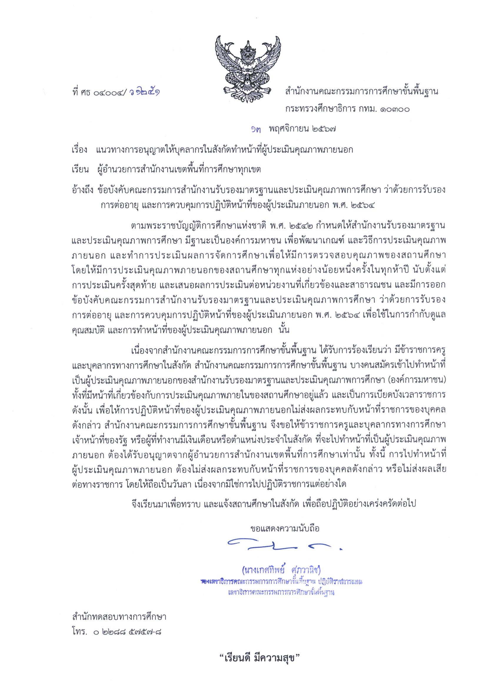 เมื่อวันที่ 13 พฤศจิกายน 2567 สำนักงานคณะกรรมการการศึกษาขั้นพื้นฐาน มีหนังสือที่ ศธ 04004/ว1251 เรื่อง แนวทางการอนุญาตให้บุคลากรในสังกัดทำหน้าที่ผู้ประเมินคุณภาพภายนอก รายละเอียด ดังนี้