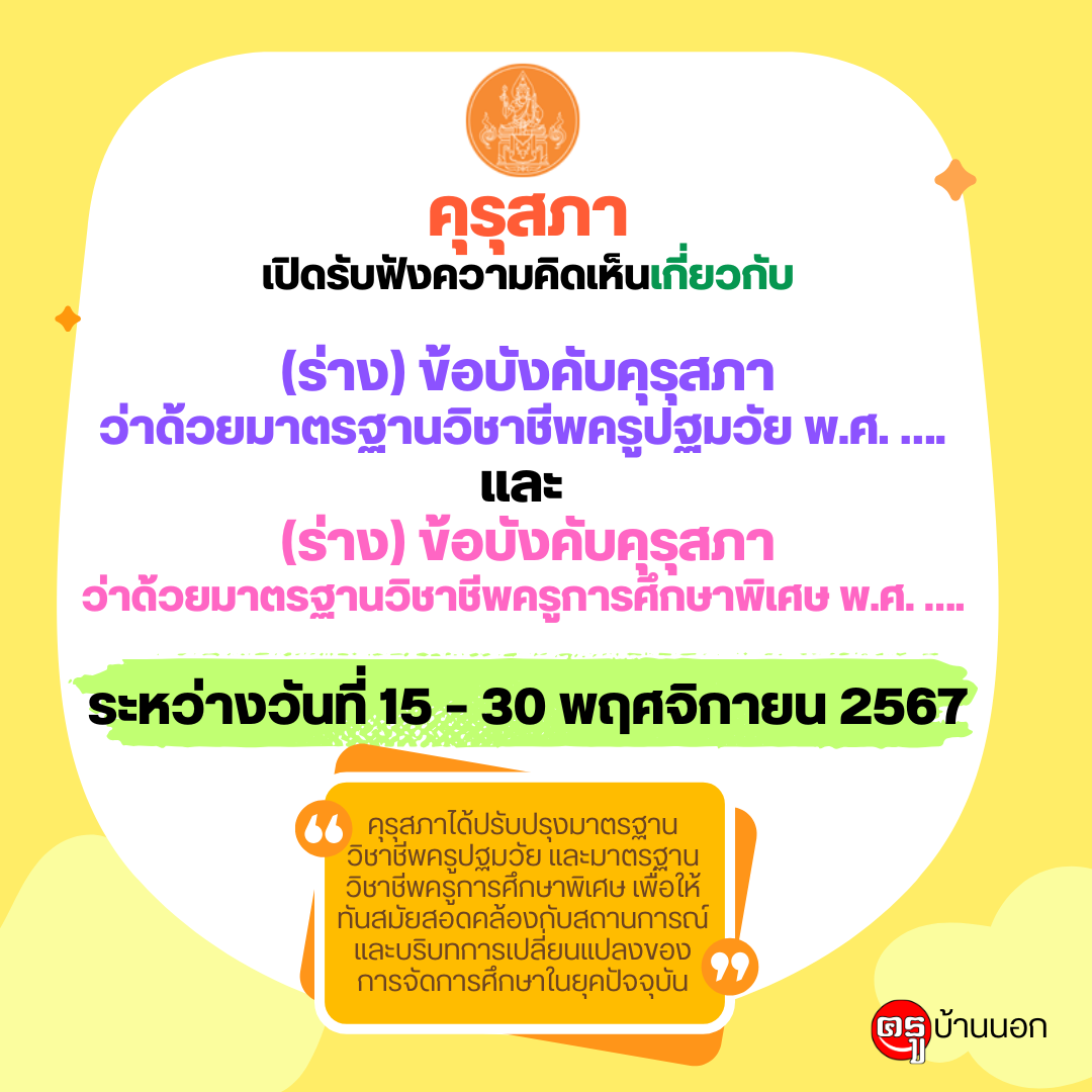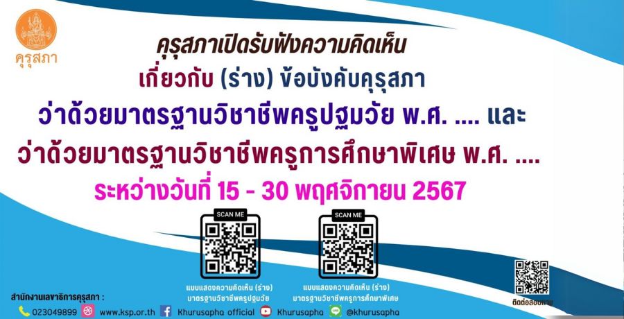จึงขอเชิญผู้ที่มีส่วนเกี่ยวข้อง ร่วมแสดงความคิดเห็นเกี่ยวกับ (ร่าง) ข้อบังคับคุรุสภาว่าด้วยมาตรฐานวิชาชีพครูปฐมวัย พ.ศ. …. และ (ร่าง) ข้อบังคับคุรุสภา ว่าด้วยมาตรฐานวิชาชีพครูการศึกษาพิเศษ พ.ศ. …. เพื่อเป็นข้อมูลประกอบการพิจารณาดำเนินการในส่วนที่เกี่ยวข้องต่อไป ผ่านทาง Google Form 2 ช่องทาง ดังนี้