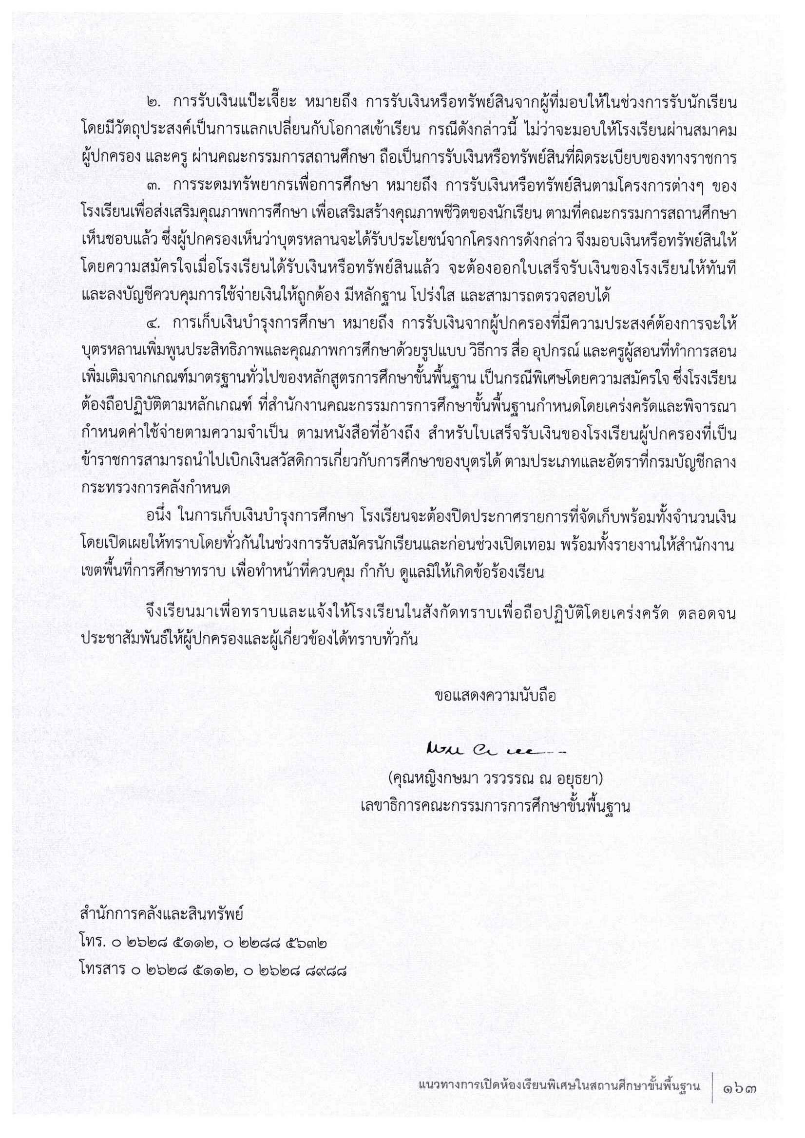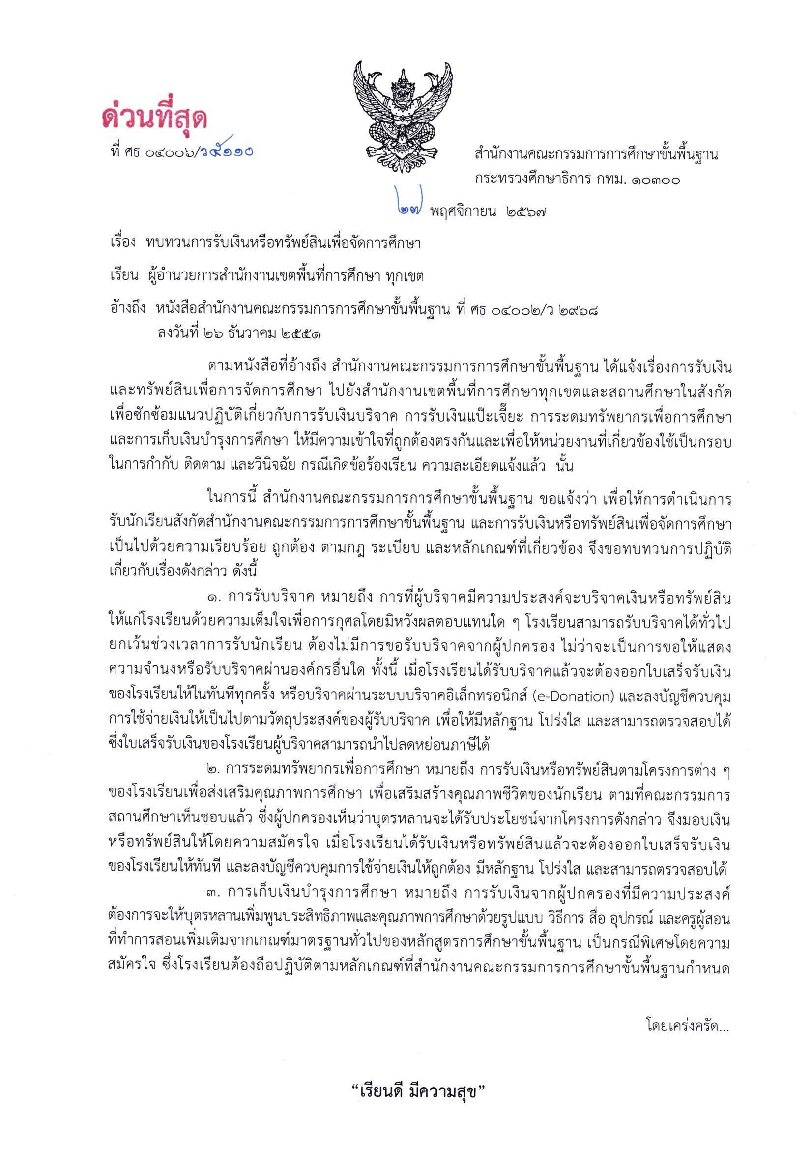 ตามหนังสือที่อ้างถึง สำนักงานคณะกรรมการการศึกษาขั้นพื้นฐาน ได้แจ้งเรื่องการรับเงิน และทรัพย์สินเพื่อการจัดการศึกษา ไปยังสำนักงานเขตพื้นที่การศึกษาทุกเขตและสถานศึกษาในสังกัด เพื่อชักซ้อมแนวปฏิบัติเกี่ยวกับการรับเงินบริจาค การรับเงินแป๊ะเจี๊ยะ การระดมทรัพยากรเพื่อการศึกษา และการเก็บเงินบำรุงการศึกษา ให้มีความเข้าใจที่ถูกต้องตรงกันและเพื่อให้หน่วยงานที่เกี่ยวข้องใช้เป็นกรอบ ในการกำกับ ติดตาม และวินิจฉัย กรณีเกิดข้อร้องเรียน ความละเอียดแจ้งแล้ว นั้น