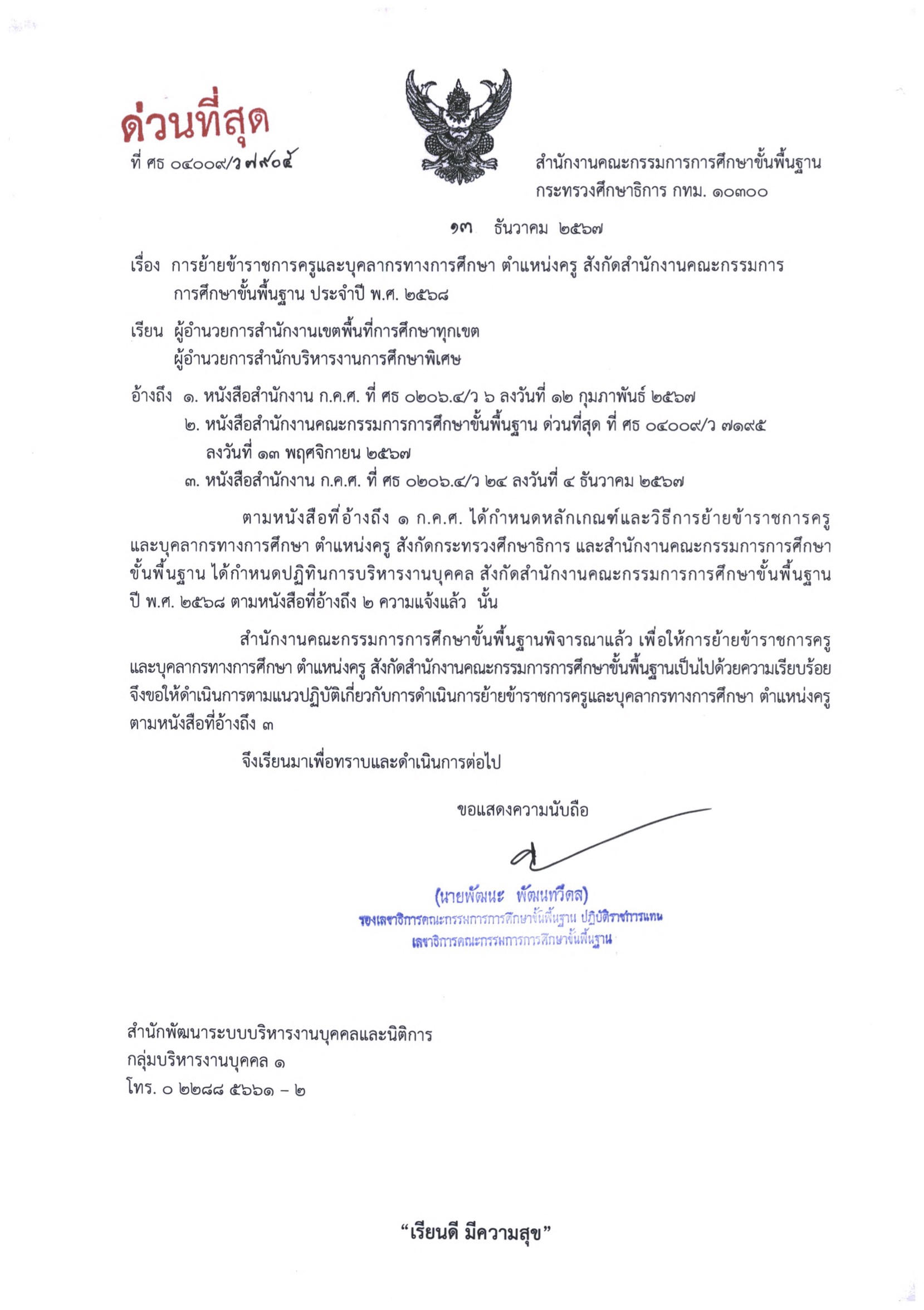 สำนักงานคณะกรรมการการศึกษาขั้นพื้นฐาน มีหนังสือ ที่ ศธ 04009/ว7905 เรื่อง การย้ายข้าราชการครูและบุคลากรทางการศึกษา ตำแหน่งครู สังกัดสำนักงานคณะกรรมการการศึกษาขั้นพื้นฐาน ประจำปี พ.ศ. 2568