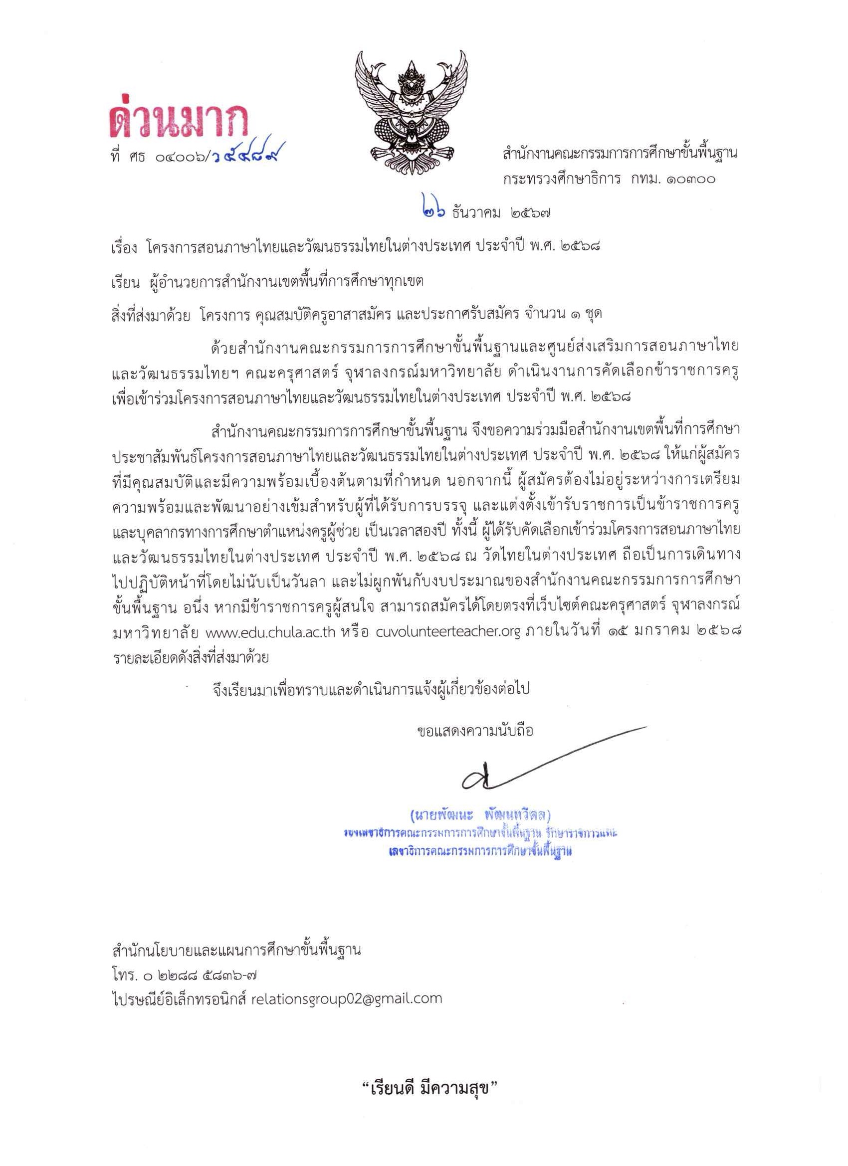 ด้วยสำนักงานคณะกรรมการการศึกษาขั้นพื้นฐานและศูนย์ส่งเสริมการสอนภาษาไทย และวัฒนธรรมไทยฯ คณะครุศาสตร์ จุฬาลงกรณ์มหาวิทยาลัย ดำเนินงานการคัดเลือกข้าราชการครูเพื่อเข้าร่วมโครงการสอนภาษาไทยและวัฒนธรรมไทยในต่างประเทศ ประจำปี พ.ศ. 2568
