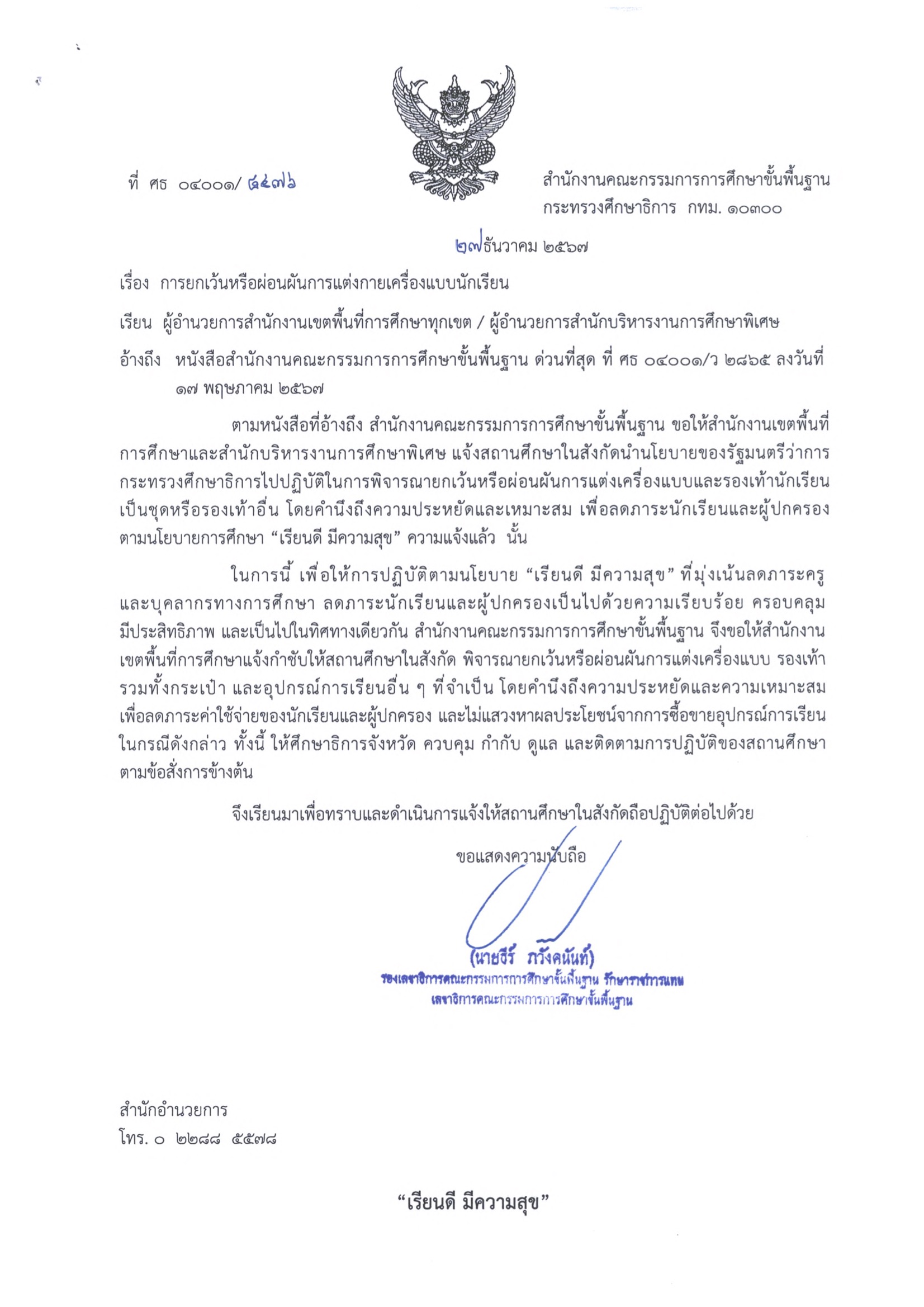 ตามที่ สำนักงานคณะกรรมการการศึกษาขั้นพื้นฐาน ขอให้สำนักงานเขตพื้นที่การศึกษาและสำนักบริหารงานการศึกษาพิเศษ แจ้งสถานศึกษาในสังกัดนำนโยบายของรัฐมนตรีว่าการกระทรวงศึกษาธิการไปปฏิบัติในการพิจารณายกเว้น หรือผ่อนผันการแต่งเครื่องแบบ และรองเท้านักเรียนเป็นชุดหรือรองเท้าอื่น โดยคำนึงถึงความประหยัดและเหมาะสม เพื่อลดภาระนักเรียนและผู้ปกครองตามนโยบายการศึกษา "เรียนดี มีความสุข" ความแจ้งแล้ว นั้น