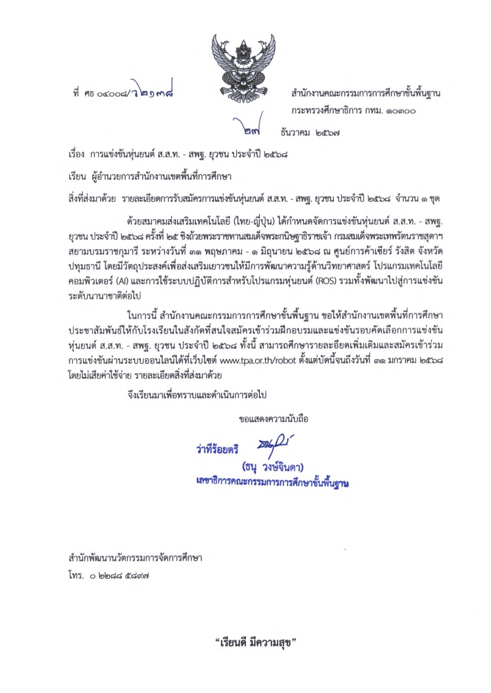 ในการนี้ สำนักงานคณะกรรมการการศึกษาขั้นพื้นฐาน ขอให้สำนักงานเขตพื้นที่การศึกษา ประชาสัมพันธ์ให้กับโรงเรียนในสังกัดที่สนใจสมัครเข้าร่วมฝึกอบรมและแข่งขันรอบคัดเลือกการแข่งขัน หุ่นยนต์ ส.ส.ท. - สพฐ. ยุวชน ประจำปี 2568 ทั้งนี้ สามารถศึกษารายละอียดเพิ่มเติมและสมัครเข้าร่วมการแข่งขันผ่านระบบออนไลน์ได้ที่เว็บไซต์ www.tpa.or.th/robot ตั้งแต่บัดนี้จนถึงวันที่ 31 มกราคม 2568 โดยไม่เสียค่าใช้จ่าย รายละเอียดสิ่งที่ส่งมาด้วย