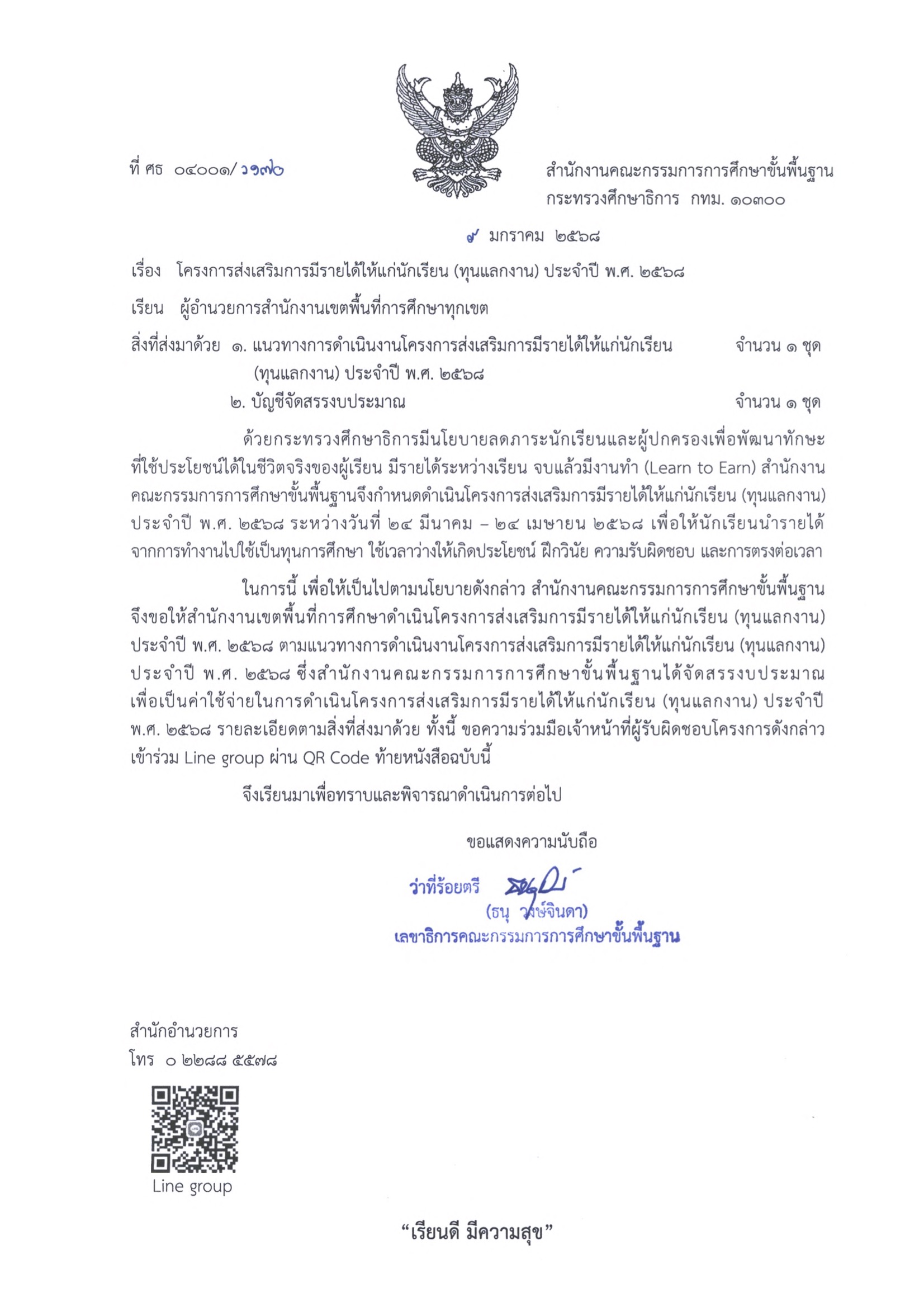 ในการนี้ เพื่อให้เป็นไปตามนโยบายดังกล่าว สำนักงานคณะกรรมการการศึกษาขั้นพื้นฐาน จึงขอให้สำนักงานเขตพื้นที่การศึกษาดำเนินโครงการส่งเสริมการมีรายได้ให้แก่นักเรียน (ทุนแลกงาน) ประจำปี พ.ศ. 2568 ตามแนวทางการดำเนินงานโครงการส่งเสริมการมีรายได้ให้แก่นักเรียน (ทุนแลกงาน)ประจำปี พ.ศ. 2568 ซึ่งสำนักงานคณะกรรมการการศึกษาขั้นพื้นฐานได้จัดสรรงบประมาณเพื่อเป็นค่าใช้จ่ายในการดำเนินโครงการส่งเสริมการมีรายได้ให้แก่นักเรียน (ทุนแลกงาน) ประจำปี พ.ศ. 2568 รายละเอียดตามสิ่งที่ส่งมาด้วย