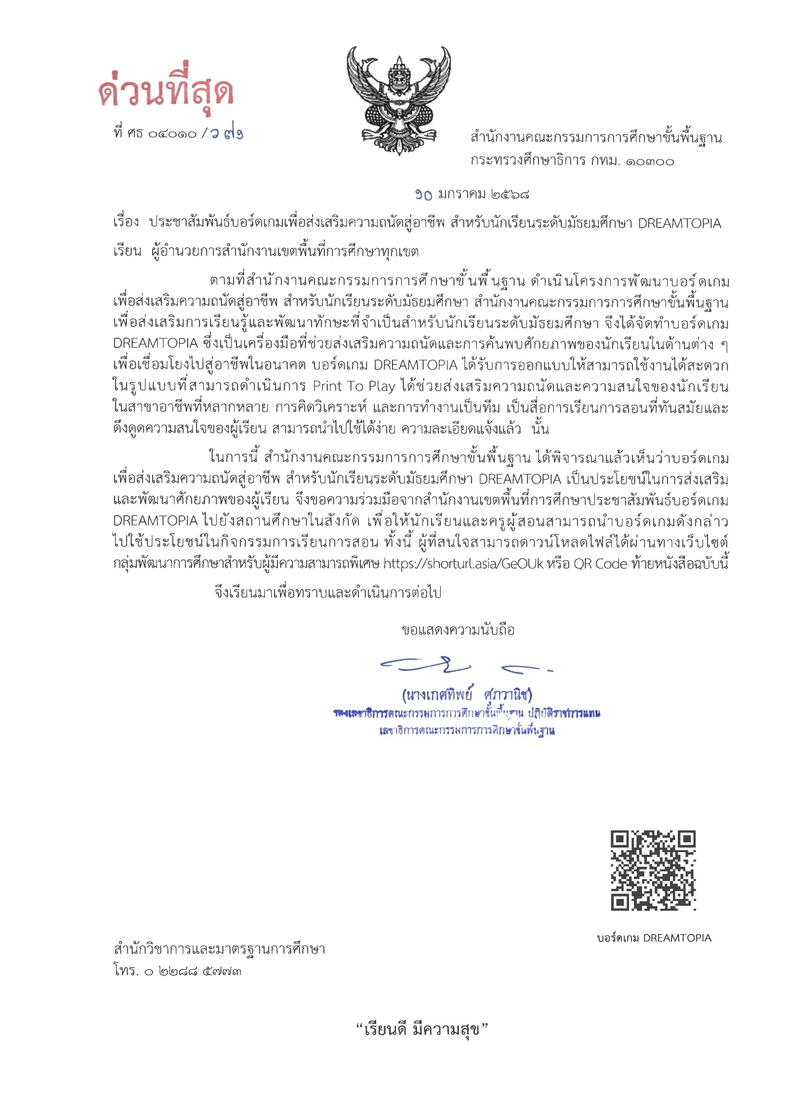 ในการนี้ สำนักงานคณะกรรมการการศึกษาขั้นพื้นฐาน ได้พิจารณาแล้วเห็นว่าบอร์ดเกม เพื่อส่งเสริมความถนัดสู่อาชีพ สำหรับนักเรียนระดับมัธยมศึกษา DREAMTOPIA เป็นประโยชน์ในการส่งเสริมและพัฒนาศักยภาพของผู้เรียน จึงขอความร่วมมือจากสำนักงานเขตพื้นที่การศึกษาประชาสัมพันธ์บอร์ดเกม DREAMTOPIA ไปยังสถานศึกษาในสังกัด เพื่อให้นักเรียนและครูผู้สอนสามารถนำบอร์ดเกมดังกล่าวไปใช้ประโยชน์ในกิจกรรมการเรียนการสอน