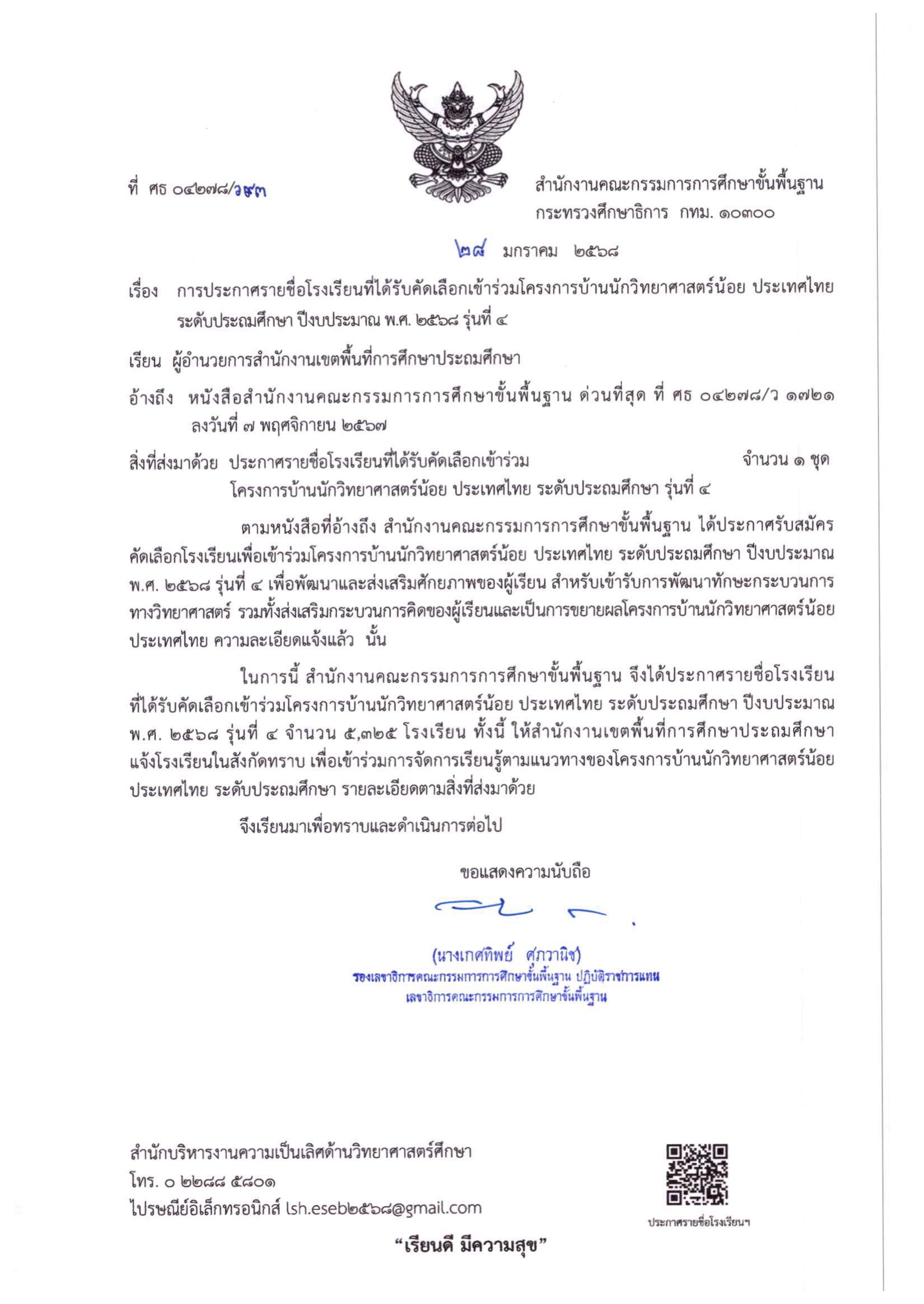 ที่ ศธ 04278/ว93 เรื่อง การประกาศรายชื่อโรงเรียนโครงการบ้านนักวิทยาศาสตร์น้อย ประเทศไทย ระดับประถมศึกษา ปีงบประมาณ พ.ศ. 2568 รุ่นที่ 4