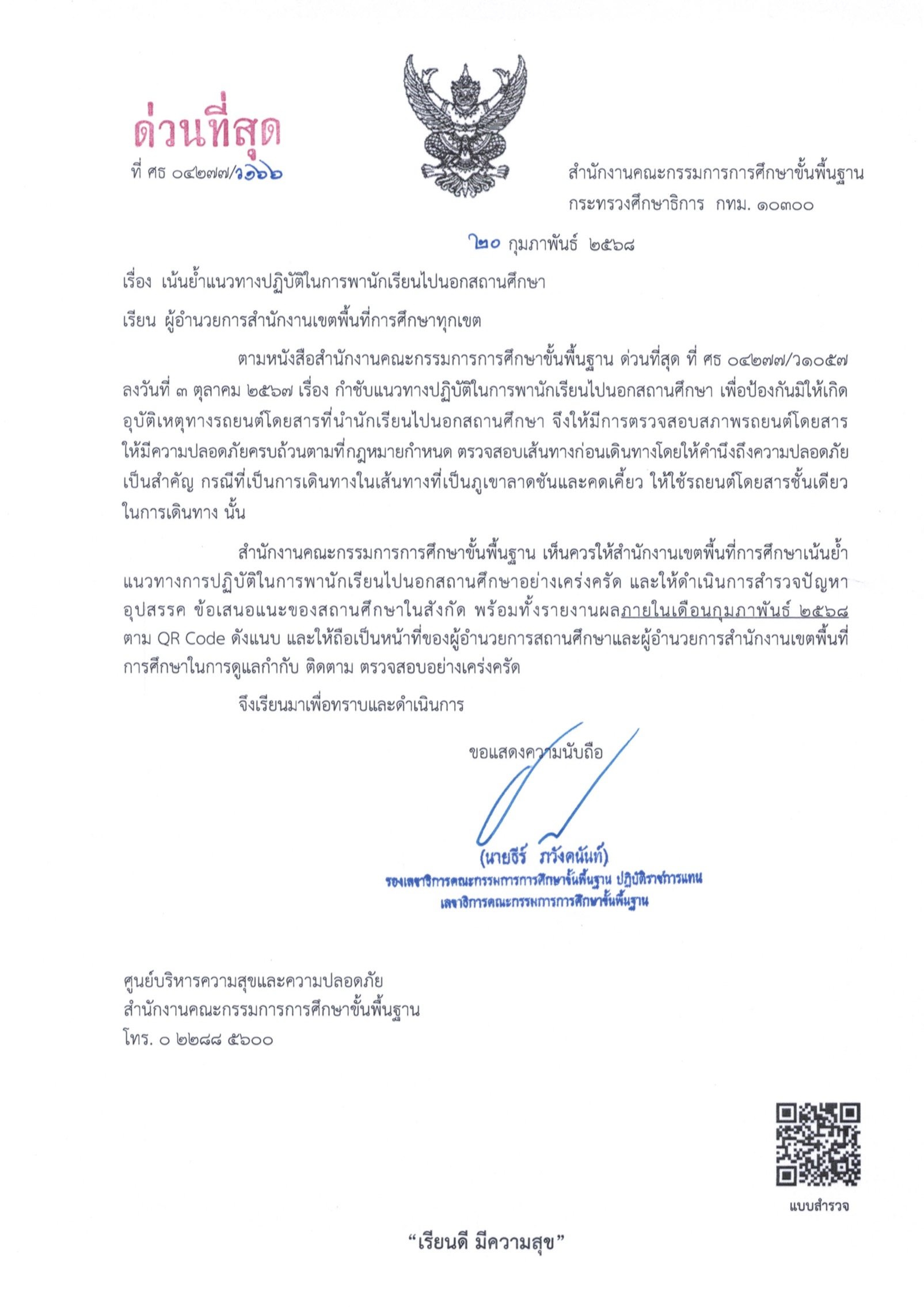 เมื่อวันที่ 20 กพ 2568 ศูนย์บริหารความสุขและความปลอดภัย สำนักงานคณะกรรมการการศึกษาขั้นพื้นฐาน ได้มีหนังสือ ที่ ศธ 04277/ว166 เน้นย้ำแนวทางปฏิบัติในการพานักเรียนไปนอกสถานศึกษา