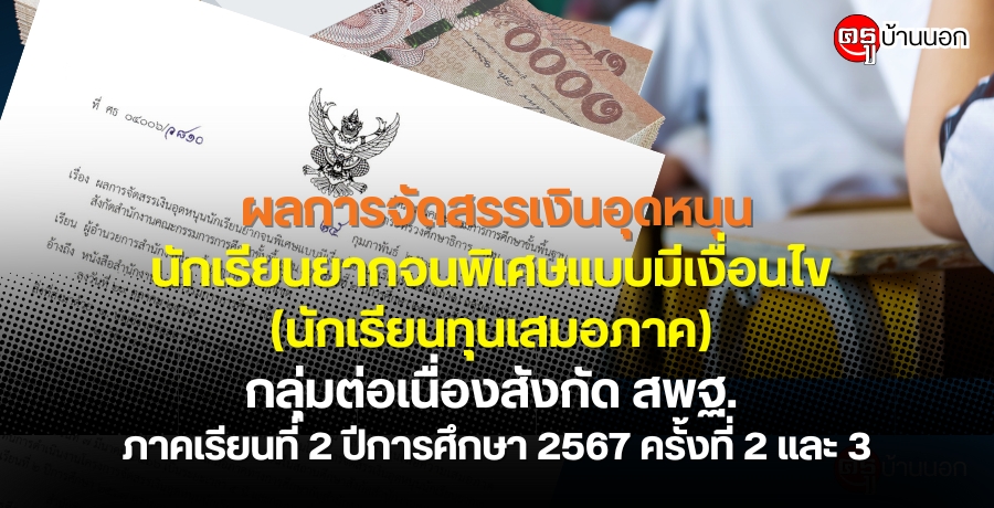 เรื่อง ผลการจัดสรรเงินอุดหนุนนักเรียนยากจนพิเศษแบบมีเงื่อนไข (นักเรียนทุนเสมอภาค) กลุ่มต่อเนื่อง สังกัดสำนักงานคณะกรรมการการศึกษาขั้นพื้นฐาน ภาคเรียนที่ 2 ปีการศึกษา 2567 ครั้งที่ 2 และ 3