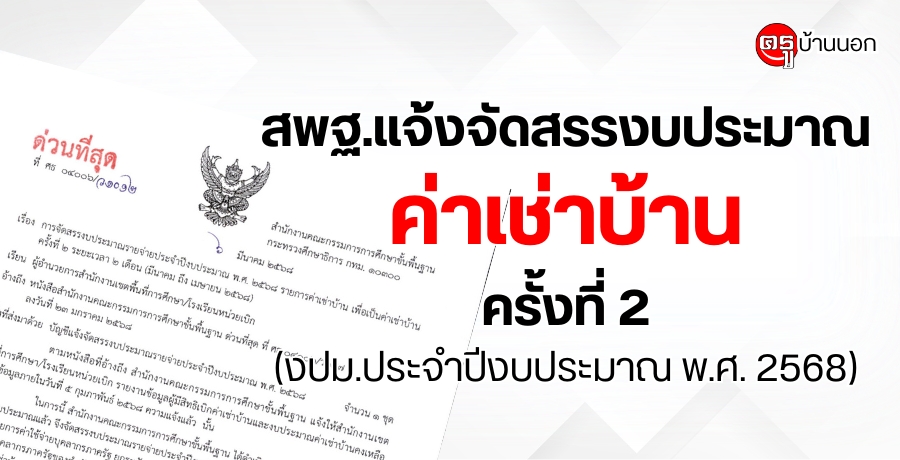 สำนักงานคณะกรรมการการศึกษาขั้นพื้นฐาน มีหนังสือที่ ศธ 04006/ว1012 เรื่อง การจัดสรรงบประมาณรายจ่ายประจำปีงบประมาณ พ.ศ. 2568 รายการค่าเช่าบ้าน เพื่อเป็นค่าเช่าบ้าน ครั้งที่ 2