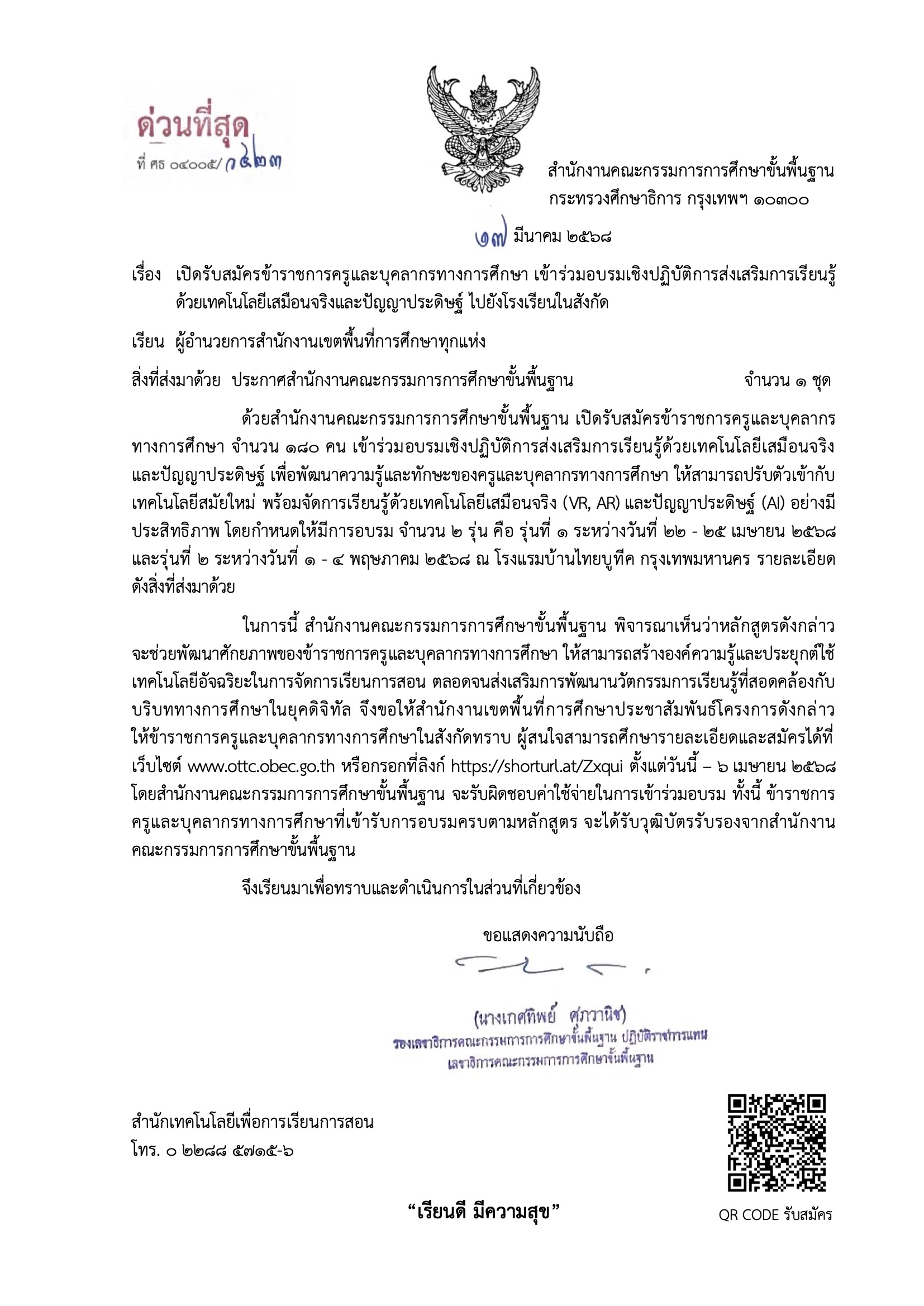 สำนักงานคณะกรรมการการศึกษาขั้นพื้นฐาน พิจารณาเห็นว่าหลักสูตรดังกล่าว จะช่วยพัฒนาศักยภาพของข้าราชการครูและบุคลากรทางการศึกษา ให้สามารถสร้างองค์ความรู้และประยุกต์ใช้เทคโนโลยีอัจฉริยะในการจัดการเรียนการสอน ตลอดจนส่งเสริมการพัฒนานวัตกรรมการเรียนรู้ที่สอดคล้องกับบริบททางการศึกษาในยุคดิจิทัล จึงขอให้สำนักงานเขตพื้นที่การศึกษาประชาสัมพันธ์โครงการดังกล่าวให้ข้าราชการครูและบุคลากรทางการศึกษาในสังกัดทราบ ผู้สนใจสามารถศึกษารายละเอียดและสมัครได้ที่ เว็บไซต์ www.ottc.obec.go.th หรือกรอกที่ลิงก์ https://shorturlat/Zxqui ตั้งแต่วันนี้ -6 เมษายน 2568โดยสำนักงานคณะกรรมการการศึกษาขั้นพื้นฐาน จะรับผิดชอบค่าใช้จ่ายในการเข้าร่วมอบรม