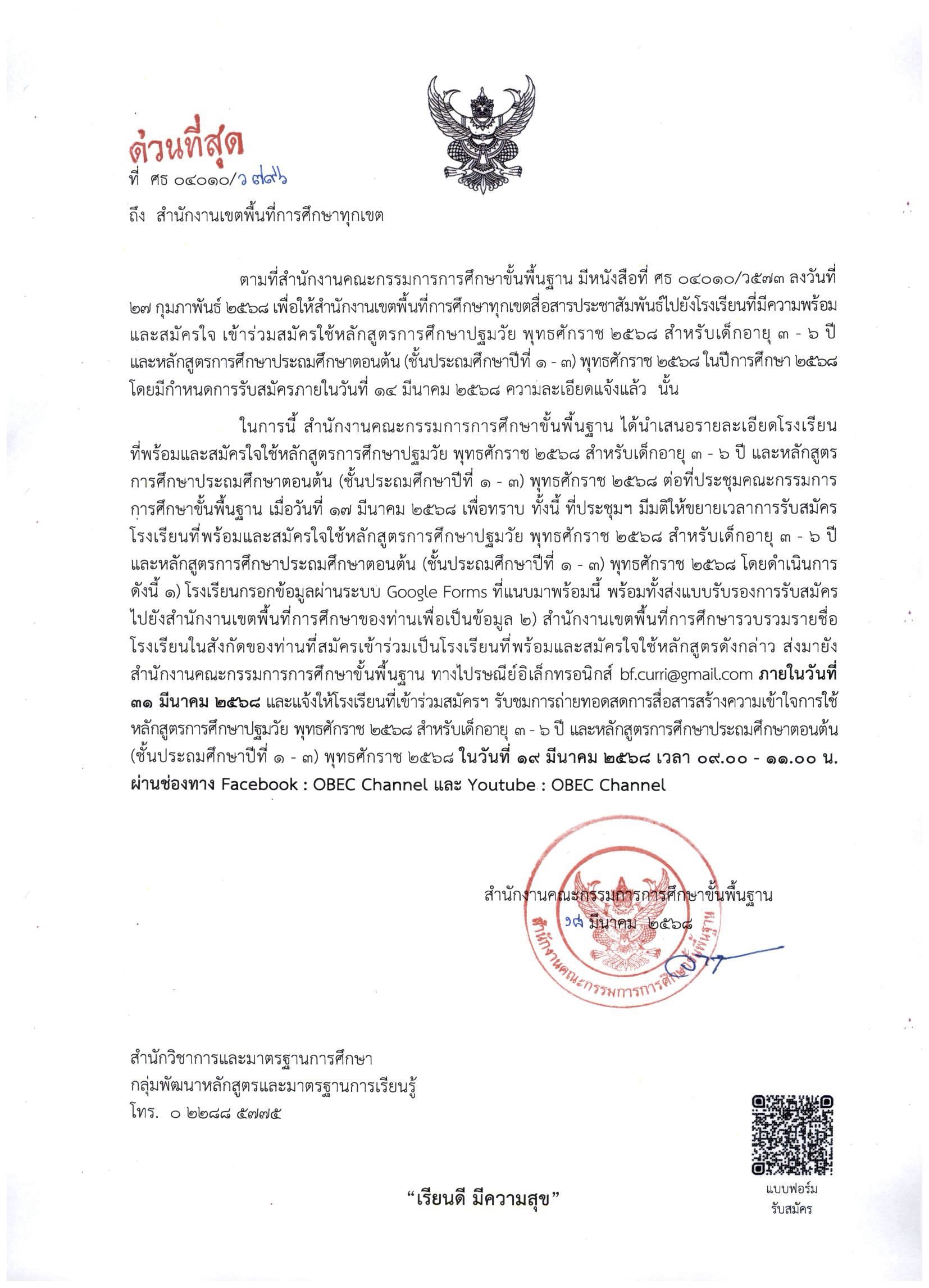 ขยายเวลาการรับสมัครโรงเรียนที่พร้อมและสมัครใจใช้หลักสูตรการศึกษาปฐมวัย พุทธศักราช 2568 สำหรับเด็กอายุ 3 - 6 ปี และหลักสูตรการศึกษาประถมศึกษาตอนต้น (ชั้นประถมศึกษาปีที่ 1 - 3) พุทธศักราช 2568