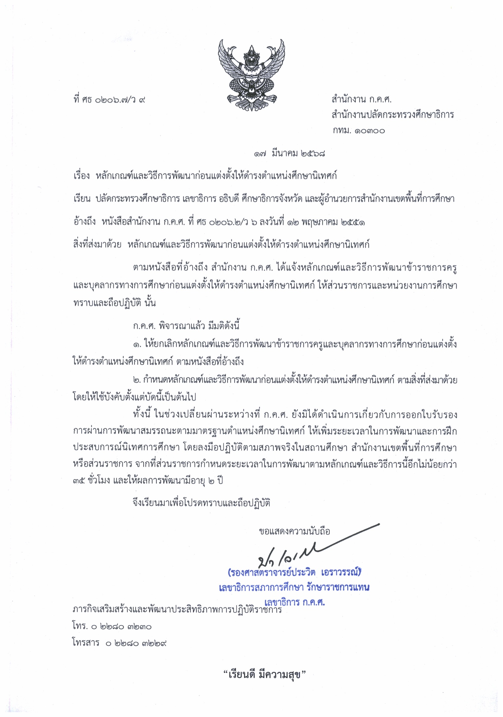 ว 9/2568 หลักเกณฑ์และวิธีการพัฒนาก่อนแต่งตั้งให้ดำรงตำแหน่งศึกษานิเทศก์