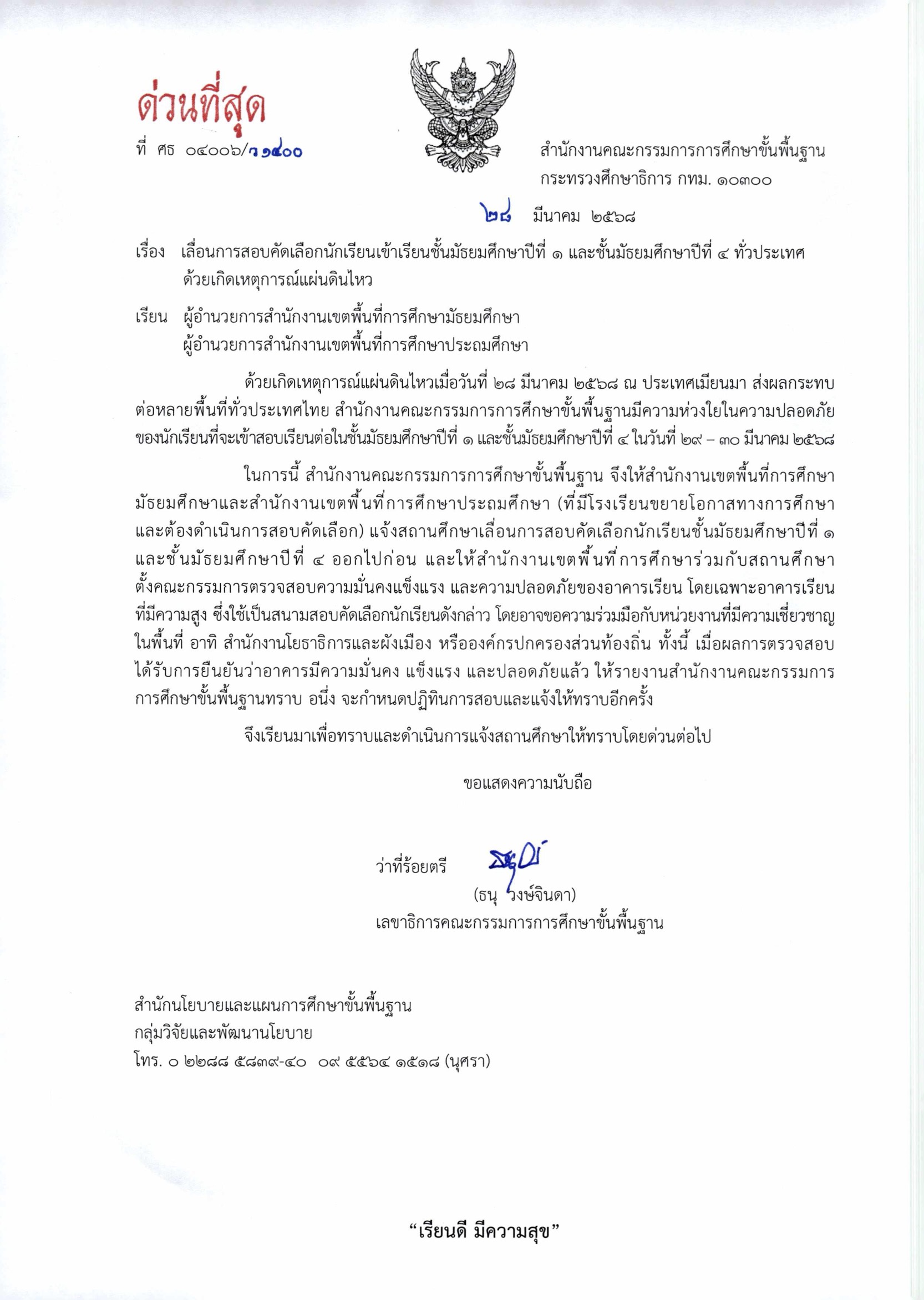 สำนักงานคณะกรรมการการศึกษาขั้นพื้นฐาน มีหนังสือ ด่วนที่สุด ที่ ศธ 04006/ว1400 เรื่อง เลื่อนการสอบคัดเลือกนักเรียนเข้าเรียนชั้นมัธยมศึกษาปีที่ 1 และชั้นมัธยมศึกษาปีที่ 4 ทั่วประเทศด้วยเกิดเหตุการณ์แผ่นดินไหว