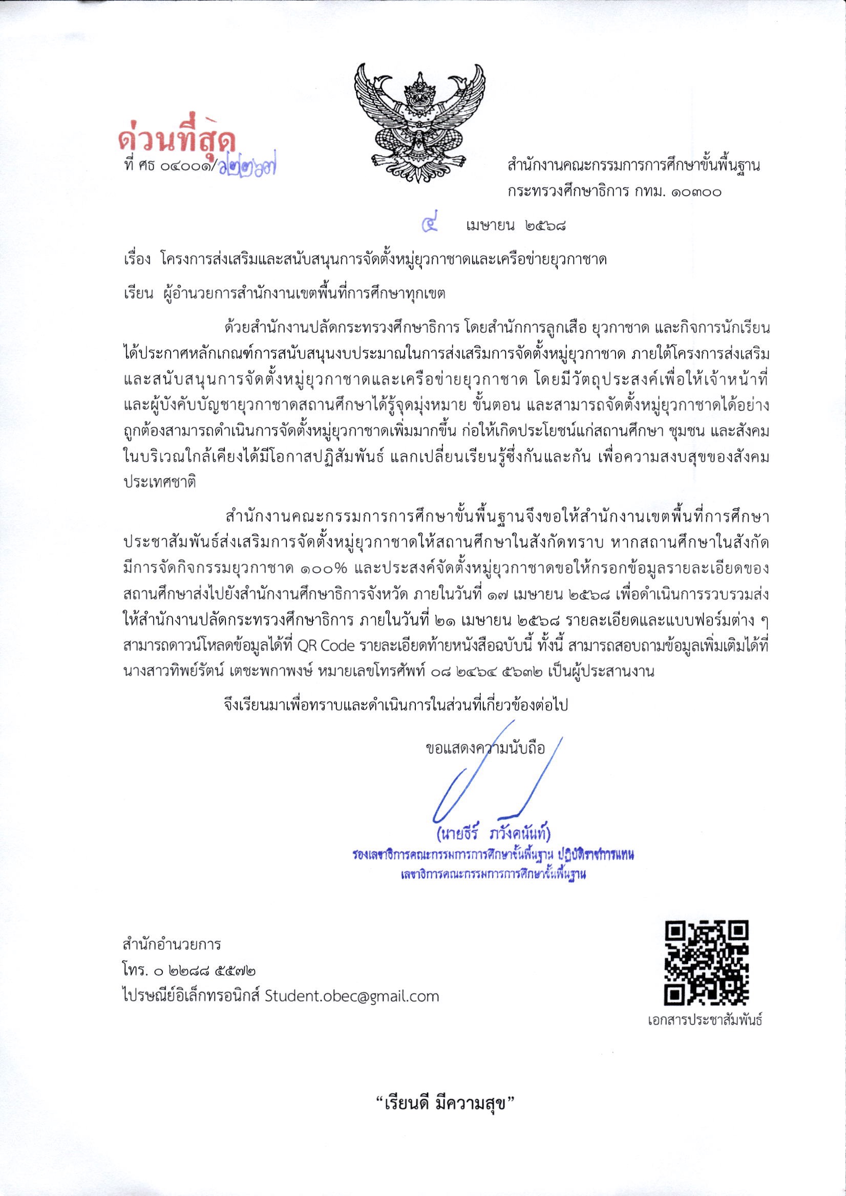 สำนักงานคณะกรรมการการศึกษาขั้นพื้นฐานจึงขอให้สำนักงานเขตพื้นที่การศึกษา ประชาสัมพันธ์ส่งเสริมการจัดตั้งหมู่ยุวกาชาดให้สถานศึกษาในสังกัดทราบ หากสถานศึกษาในสังกัด มีการจัดกิจกรรมยุวกาชาด 100% และประสงค์จัดตั้งหมู่ยุวกาชาดขอให้กรอกข้อมูลรายละเอียดของสถานศึกษาส่งไปยังสำนักงานศึกษาธิการจังหวัด ภายในวันที่ 17 เมษายน 2568 เพื่อดำเนินการรวบรวมส่ง ให้สำนักงานปลัดกระทรวงศึกษาธิการ ภายในวันที่ 21 เมษายน 2568 รายละเอียดและแบบฟอร์มต่าง ๆ สามารถดาวน์โหลดข้อมูลได้ที่ลิงก์ด้านล่างนี้