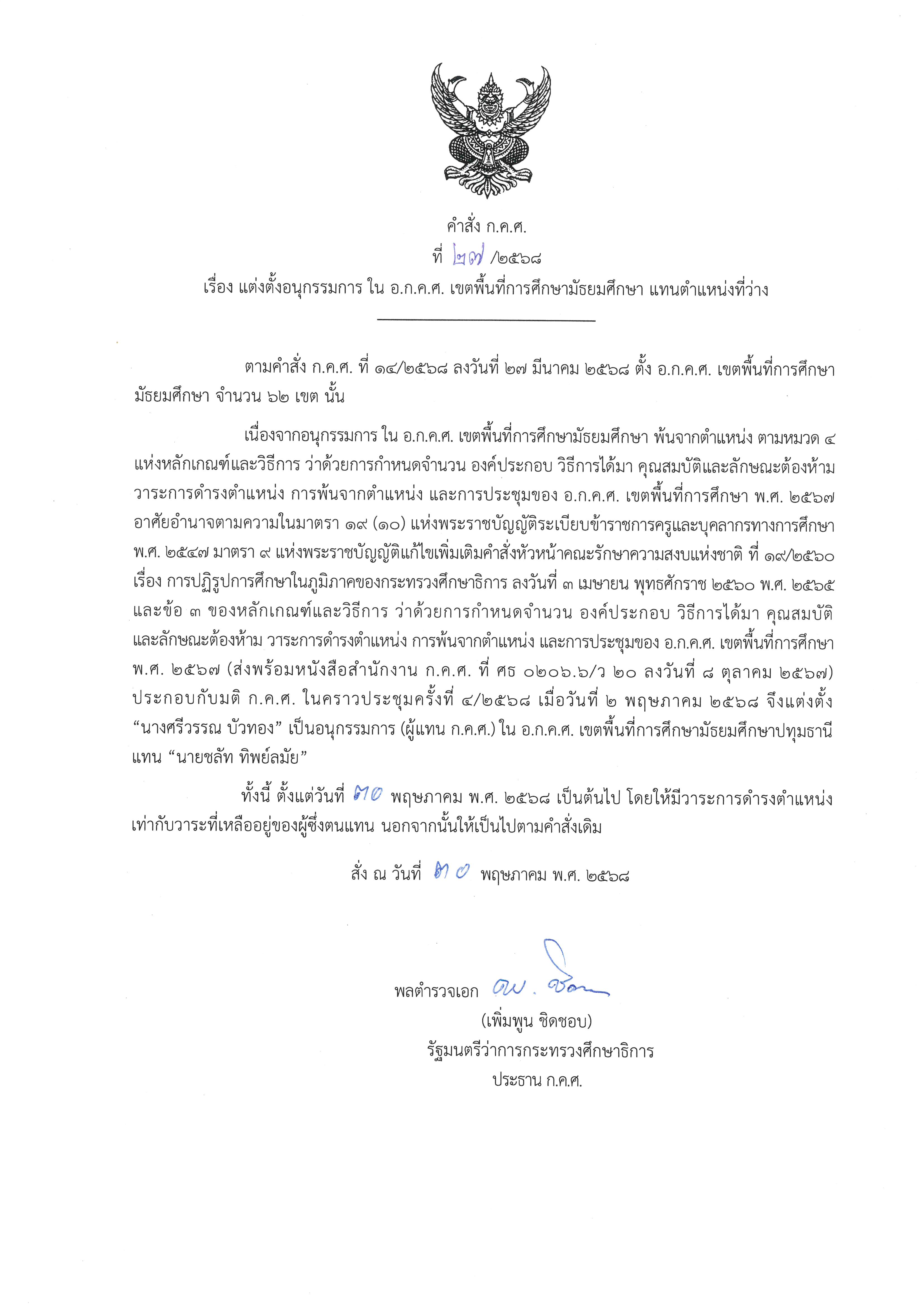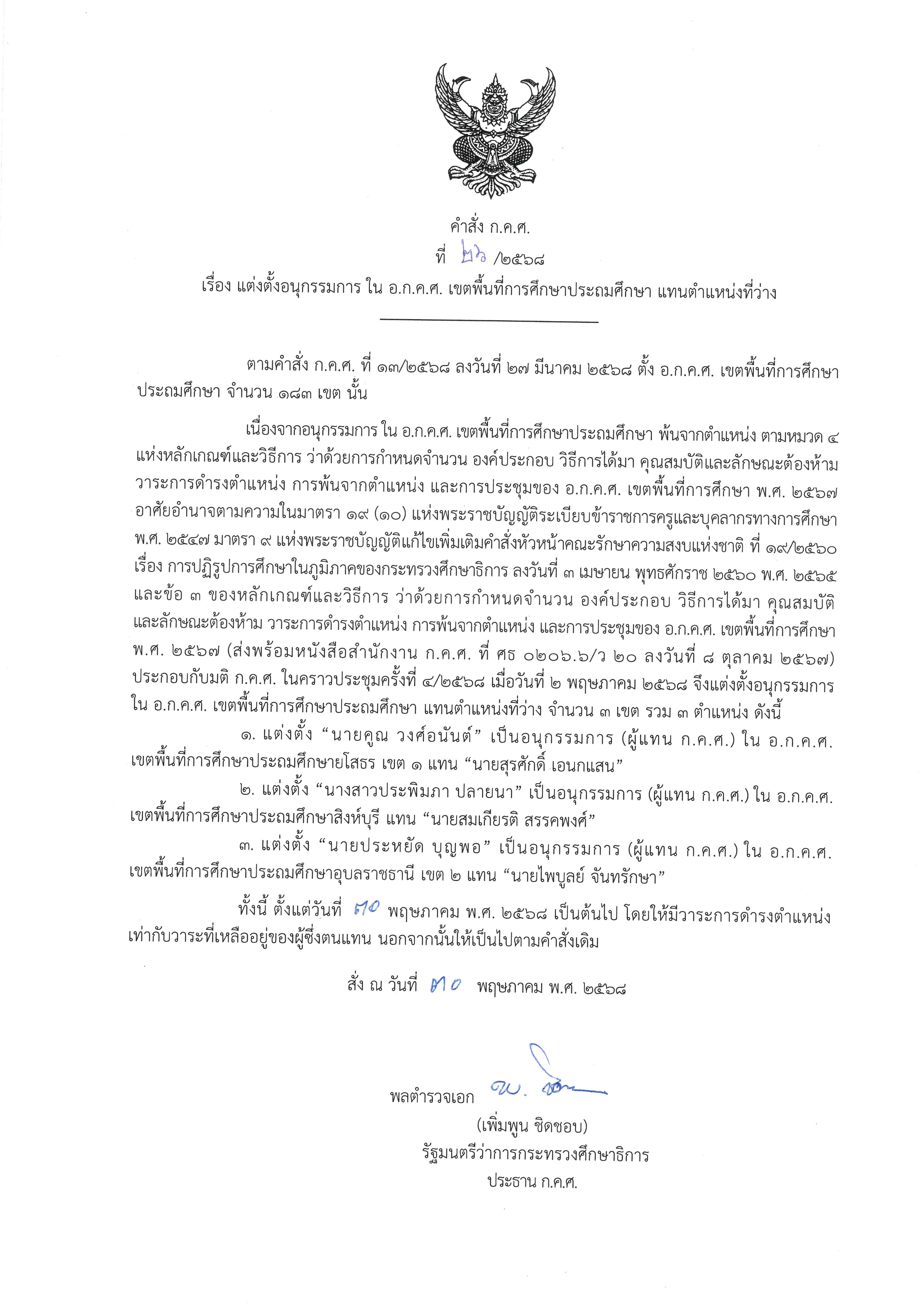 ประกาศคณะกรรมการข้าราชการครูและบุคลากรทางการศึกษา เรื่อง แต่งตั้งอนุกรรมการ ใน อ.ก.ค.ศ. เขตพื้นที่การศึกษาประถมศึกษา/มัธยมศึกษา แทนตำแหน่งที่ว่าง