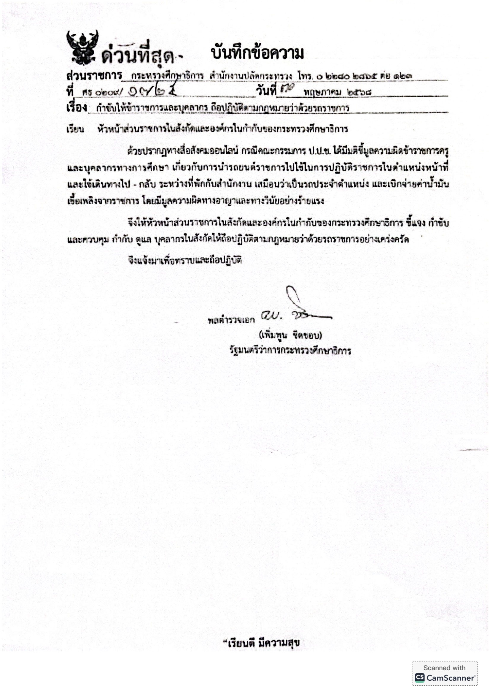 สำนักงานคณะกรรมการการศึกษาขั้นพื้นฐาน มีหนังสือที่ ศธ 04001/ว3975 เรื่อง กำชับให้ข้าราชการและบุคลากรถือปฏิบัติตามกฎหมายว่าด้วยรถราชการ