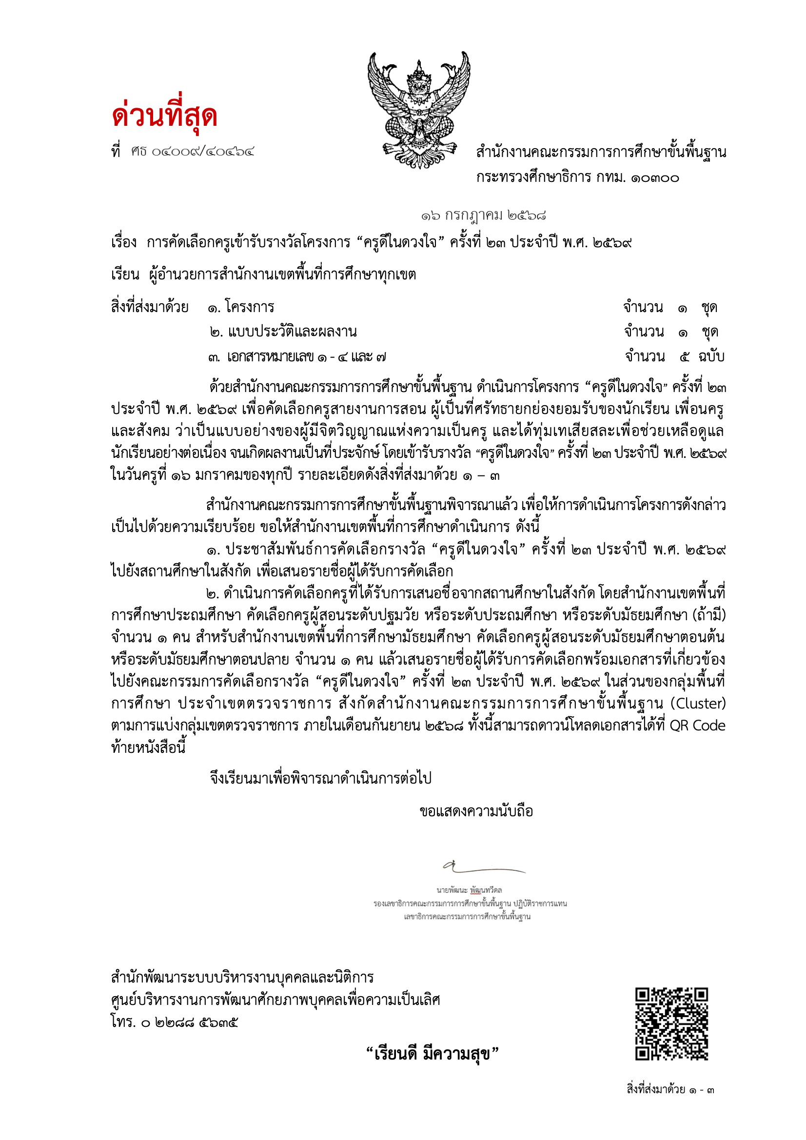 ๑. ประชาสัมพันธ์การคัดเลือกรางวัล "ครูดีในดวงใจ" ครั้งที่ ๒๓ ประจำปี พ.ศ. ๒๕๖๙ ไปยังสถานศึกษาในสังกัด เพื่อเสนอรายชื่อผู้ได้รับการคัดเลือก