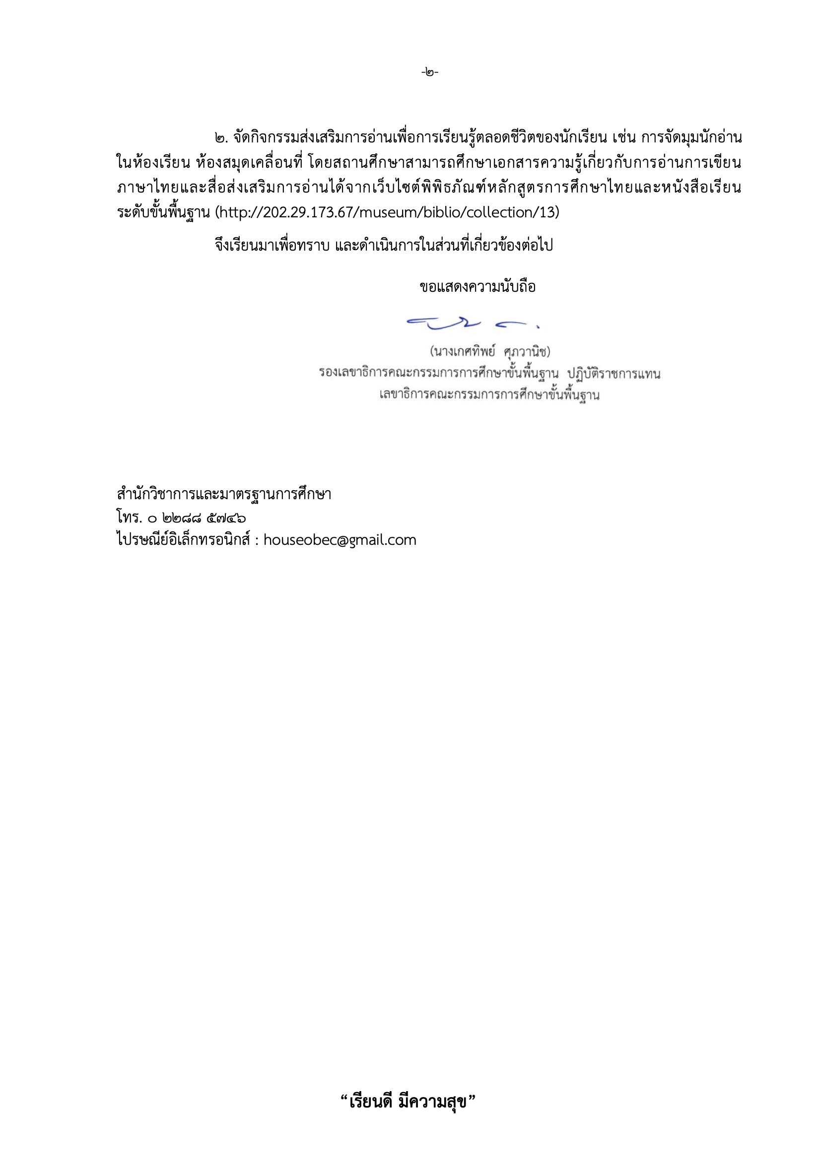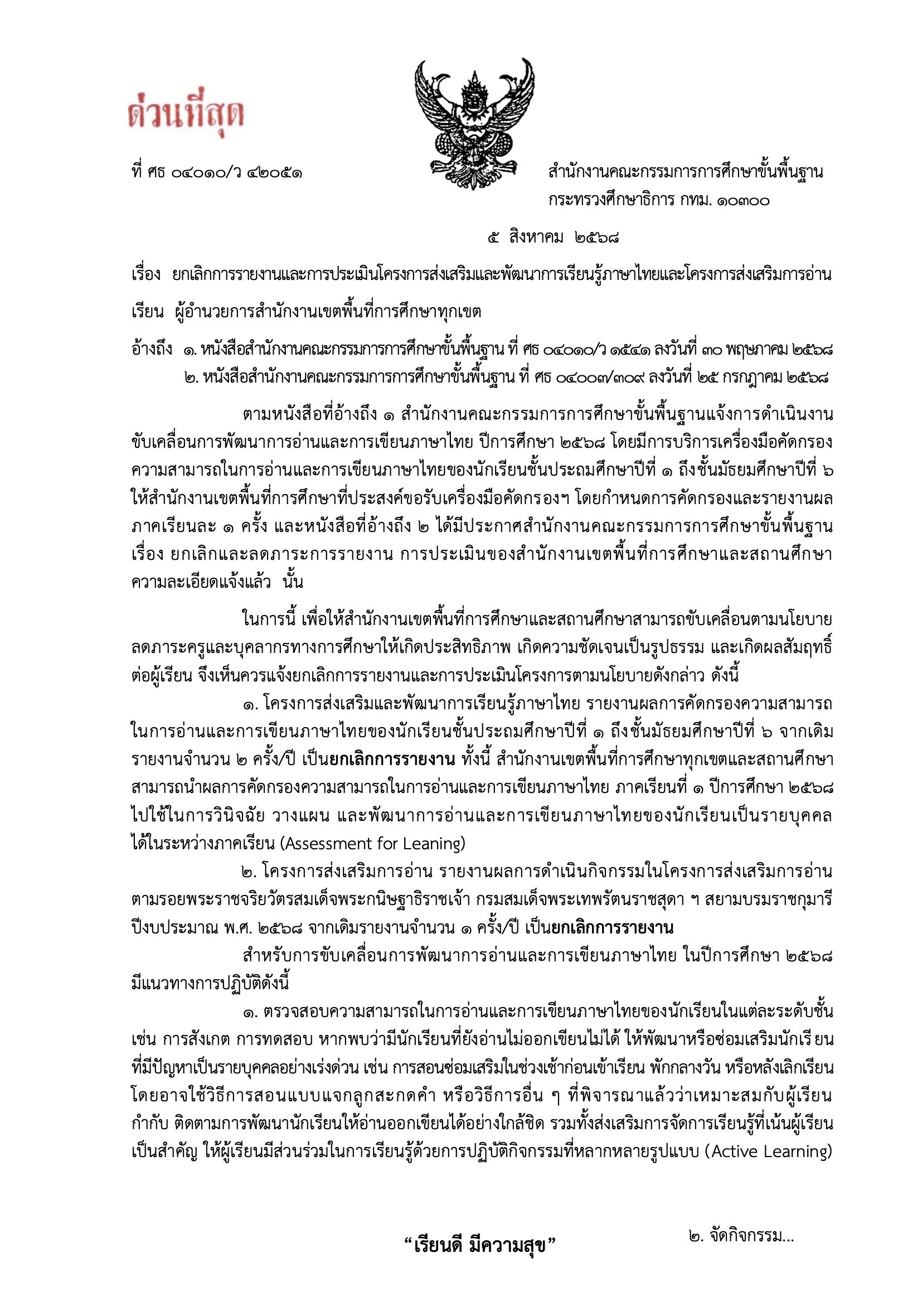 สำนักงานคณะกรรมการการศึกษาขั้นพื้นฐาน มีหนังสือที่ ศธ 04010/ว 42051 เรื่อง ยกเลิกการรายงานและการประเมินโครงการส่งเสริมและพัฒนาการเรียนรู้ภาษาไทยและโครงการส่งเสริมการอ่าน โดยมีรายละเอียด ดังนี้