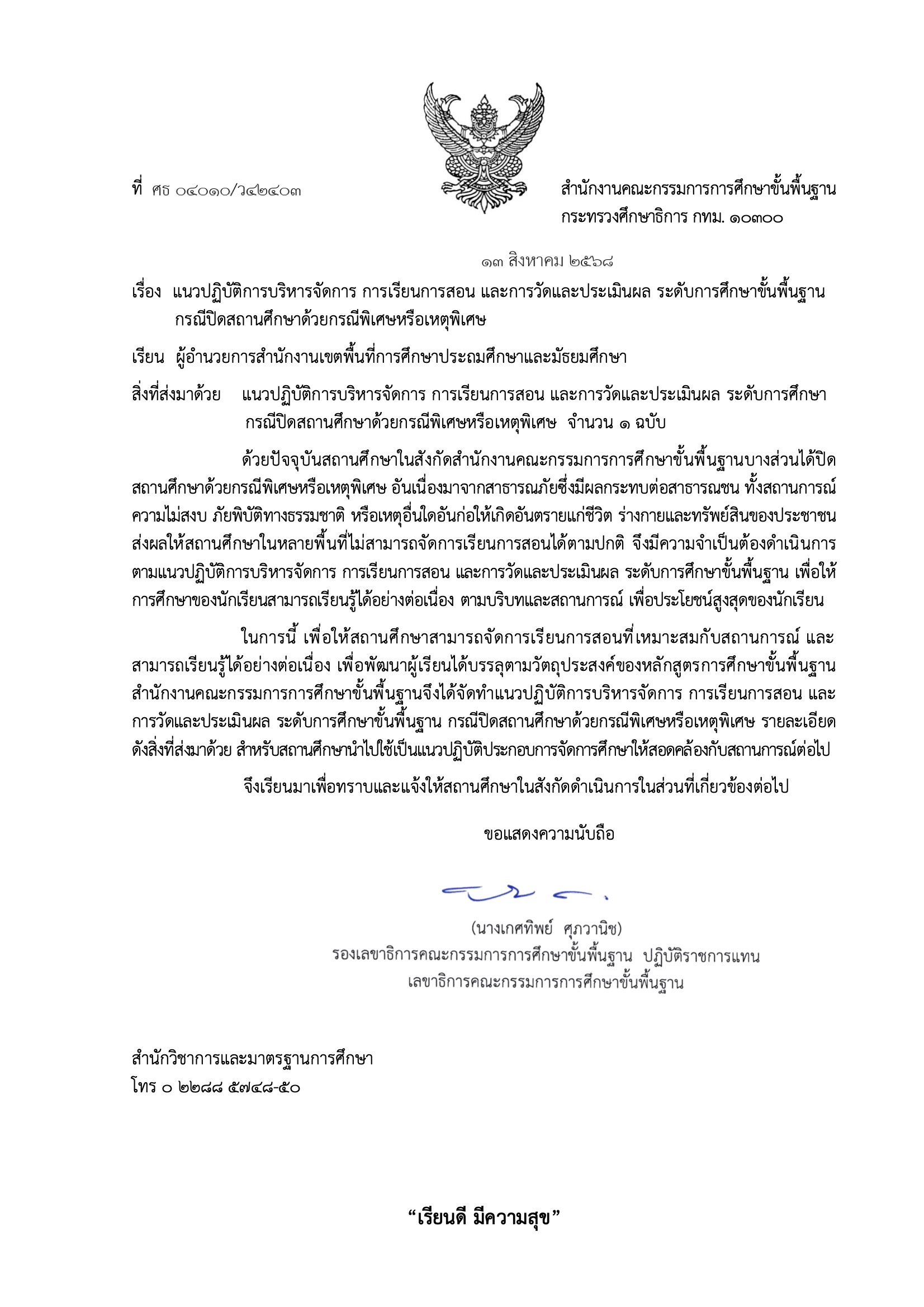 สำนักงานคณะกรรมการการศึกษาขั้นพื้นฐานได้จัดทำแนวปฏิบัติการบริหารจัดการ การเรียนการสอน และการวัดและประเมินผล ระดับการศึกษาขั้นพื้นฐาน กรณีปิดสถานศึกษาด้วยกรณีพิเศษหรือเหตุพิเศษ รายละเอียด ดังสิ่งที่ส่งมาด้วย สำหรับสถานศึกษาเพื่อนำไปใช้เป็นแนวปฏิบัติประกอบการจัดการศึกษาให้สอดคล้องกับสถานการณ์ต่อไป