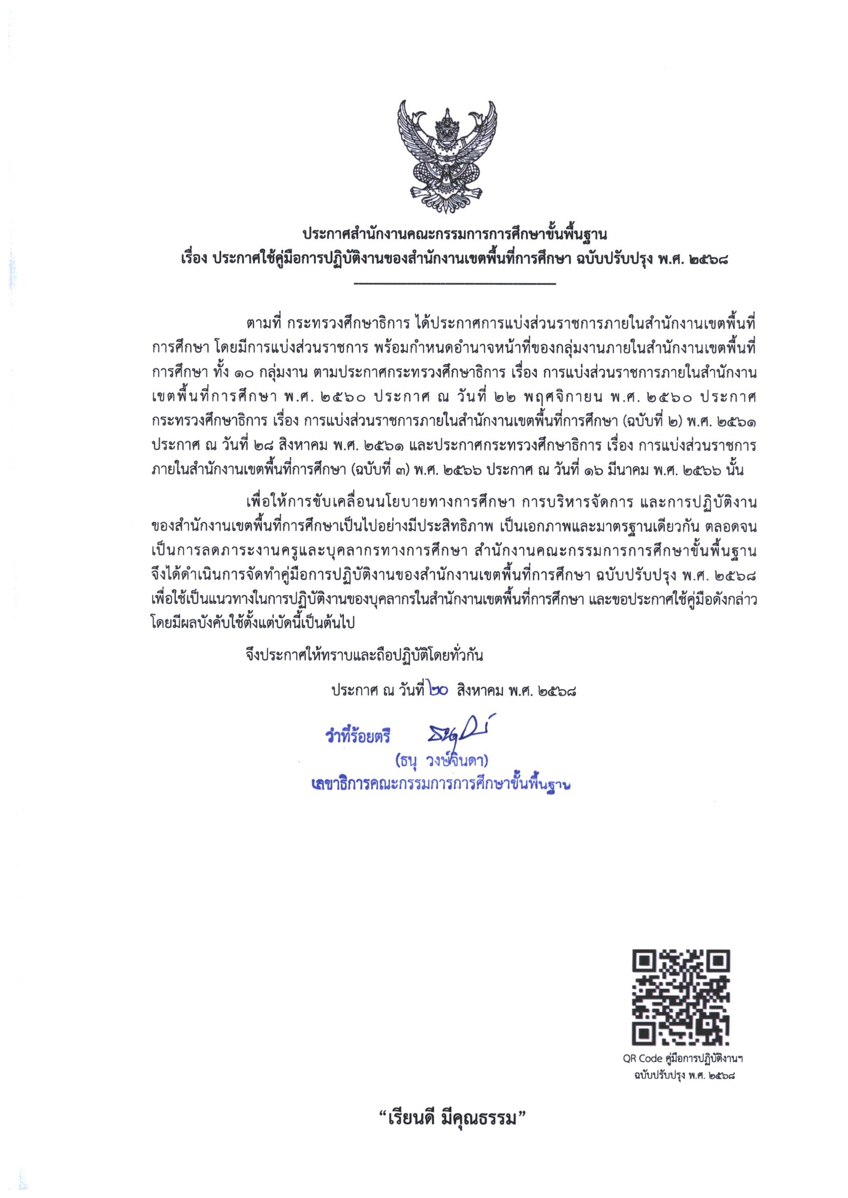 ด้วยสำนักงานคณะกรรมการการศึกษาขั้นพื้นฐาน ได้จัดทำคู่มือการปฏิบัติงานของสำนักงานเขตพื้นที่การศึกษา ฉบับปรับปรุง พ.ศ. ๒๕๖๘ โดยกำหนดภารกิจ ขั้นตอน และวิธีดำเนินงานที่สอดคล้อง กับกฎหมาย ระเบียบ และข้อเสนอแนะจากการปฏิบัติงานจริง ครอบคลุมทั้ง ๑๐ กลุ่มงาน เพื่อเป็นมาตรฐานกลางในการปฏิบัติงานให้มีประสิทธิภาพ โปร่งใส ตรวจสอบได้ และตอบสนองต่อบริบทการบริหารจัดการศึกษาในปัจจุบันและอนาคต