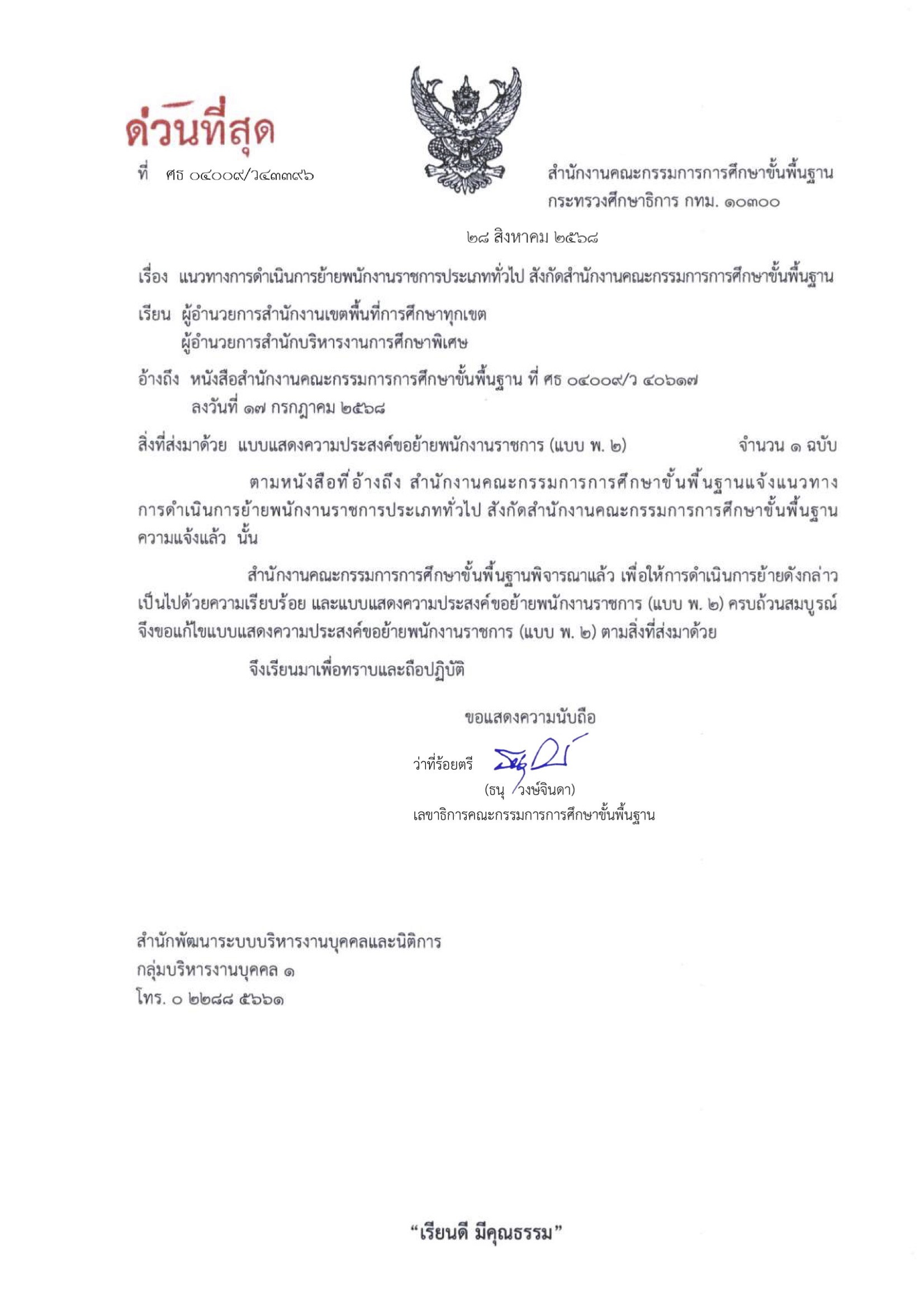 ที่ ศธ 04009/ว43396 เรื่อง แนวทางการดำเนินการย้ายพนักงานราชการประเภททั่วไป สังกัด สพฐ.
