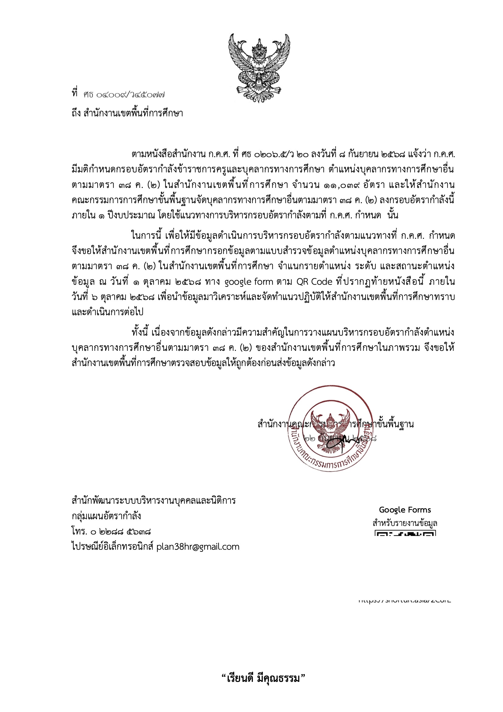 ในการนี้ เพื่อให้มีข้อมูลดำเนินการบริหารกรอบอัตรากำลังตามแนวทางที่ ก.ค.ศ. กำหนด จึงขอให้สำนักงานเขตพื้นที่การศึกษากรอกข้อมูลตามแบบสำรวจข้อมูลตำแหน่งบุคลากรทางการศึกษาอื่นตามมาตรา 38 ค. (2) ในสำนักงานเขตพื้นที่การศึกษา จำแนกรายตำแหน่ง ระดับ และสถานะตำแหน่ง ข้อมูล ณ วันที่ 1 ตุลาคม 2568 ทาง google form ตาม OR Code ที่ปรากฏท้ายหนังสือนี้ ภายใน วันที่ 6 ตุลาคม 2568 เพื่อนำข้อมูลมาวิเคราะห์และจัดทำแนวปฏิบัติให้สำนักงานเขตพื้นที่การศึกษาทราบและดำเนินการต่อไป