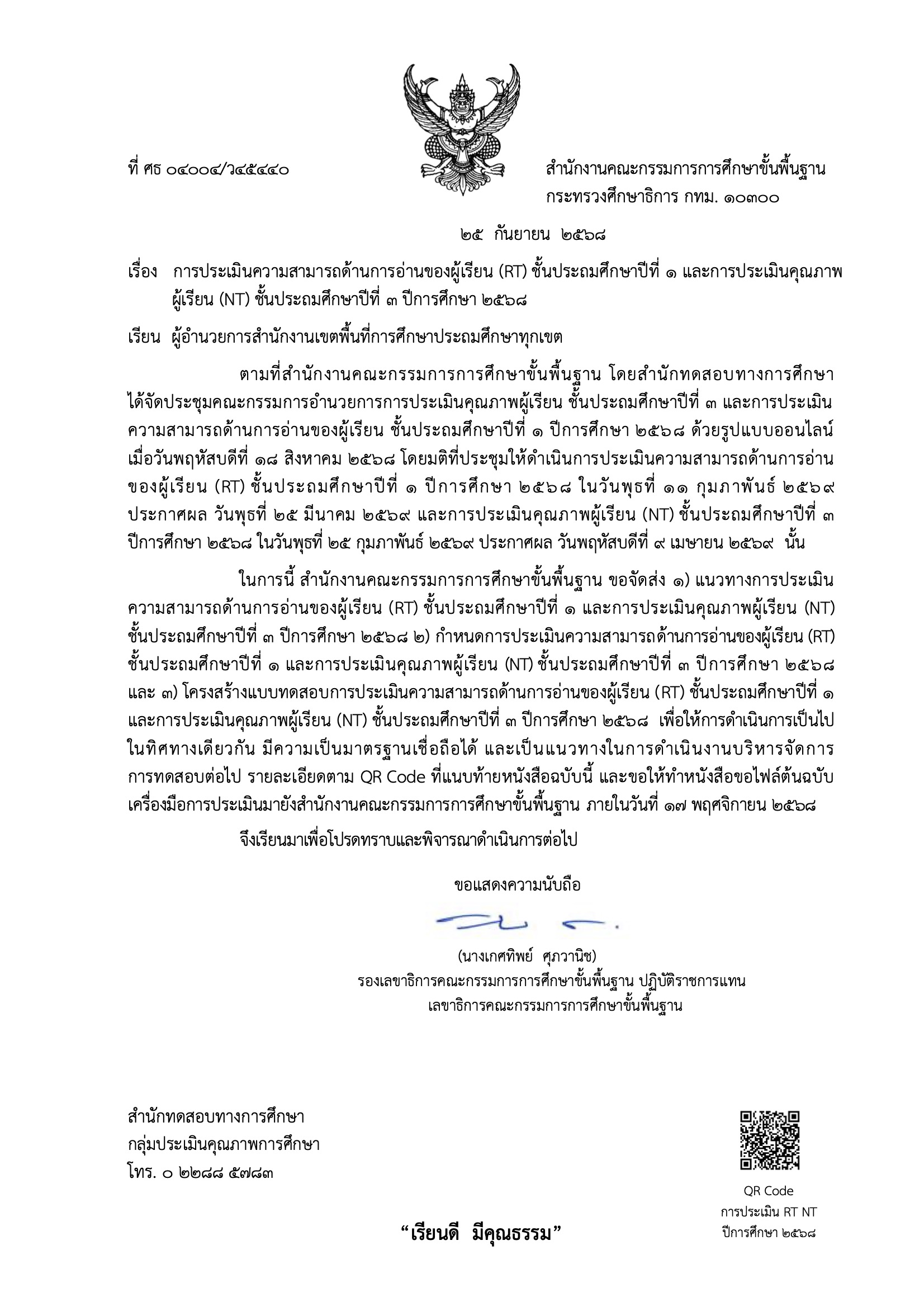 การประเมินความสามารถด้านการอ่านของผู้เรียน (RT) ชั้นประถมศึกษาปีที่ 1 และการประเมินคุณภาพผู้เรียน (NT) ชั้นประถมศึกษาปีที่ 3 ปีการศึกษา 2568
