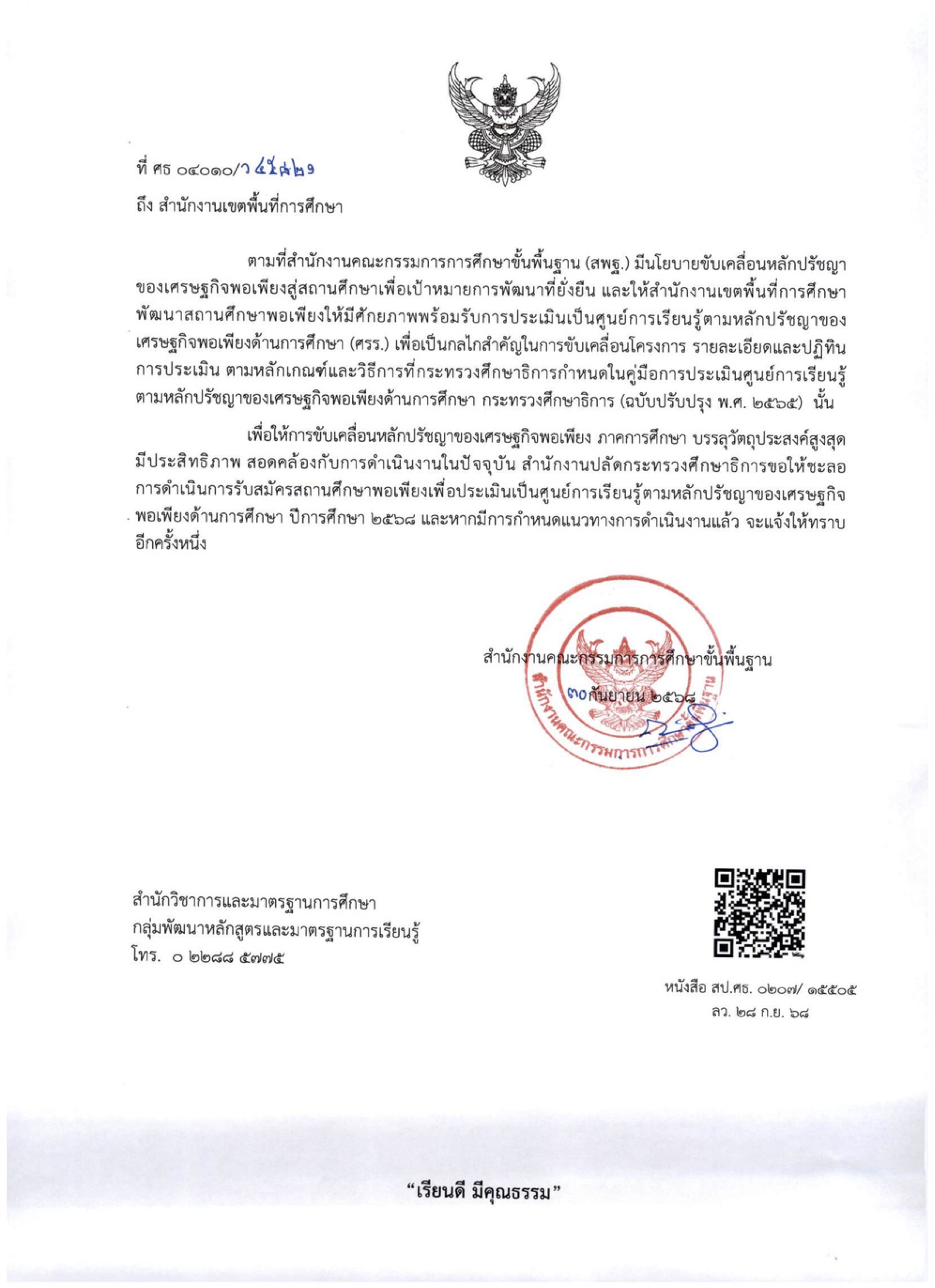 ตามที่สำนักงานคณะกรรมการการศึกษาขั้นพื้นฐาน (สพฐ.) มีนโยบายขับเคลื่อนหลักปรัชญา ของเศรษฐกิจพอเพียงสู่สถานศึกษาเพื่อเป้าหมายการพัฒนาที่ยั่งยืน และให้สำนักงานเขตพื้นที่การศึกษา พัฒนาสถานศึกษาพอเพียงให้มีศักยภาพพร้อมรับการประเมินเป็นศูนย์การเรียนรู้ตามหลักปรัชญาของเศรษฐกิจพอเพียงด้านการศึกษา (ศรร.) เพื่อเป็นกลไกสำคัญในการขับเคลื่อนโครงการ รายละเอียดและปฏิทินการประเมิน ตามหลักเกณฑ์และวิธีการที่กระทรวงศึกษาธิการกำหนดในคู่มือการประเมินศูนย์การเรียนรู้ตามหลักปรัชญาของเศรษฐกิจพอเพียงด้านการศึกษา กระทรวงศึกษาธิการ (ฉบับปรับปรุง พ.ศ. ๒๕๖๕) นั้น