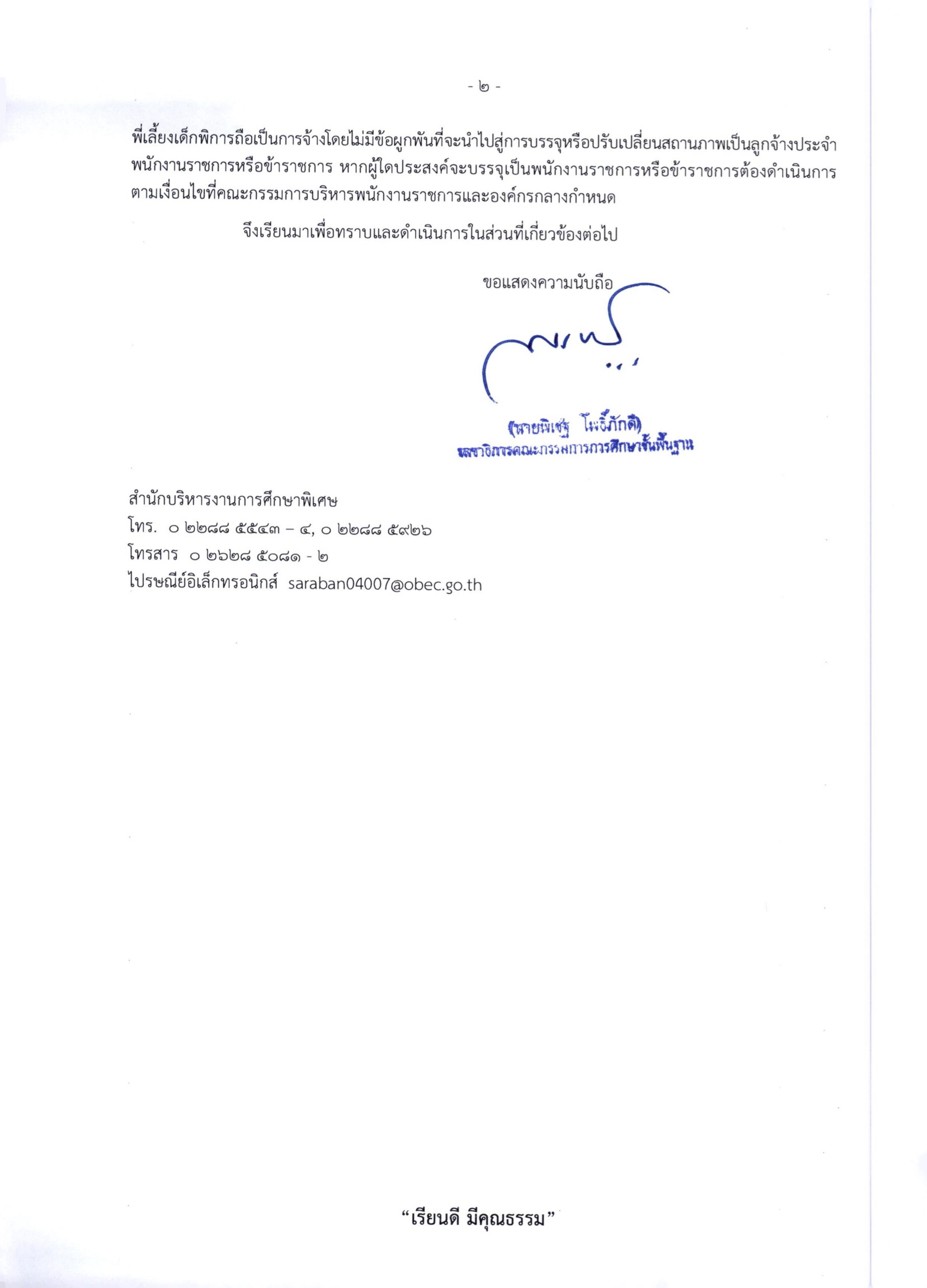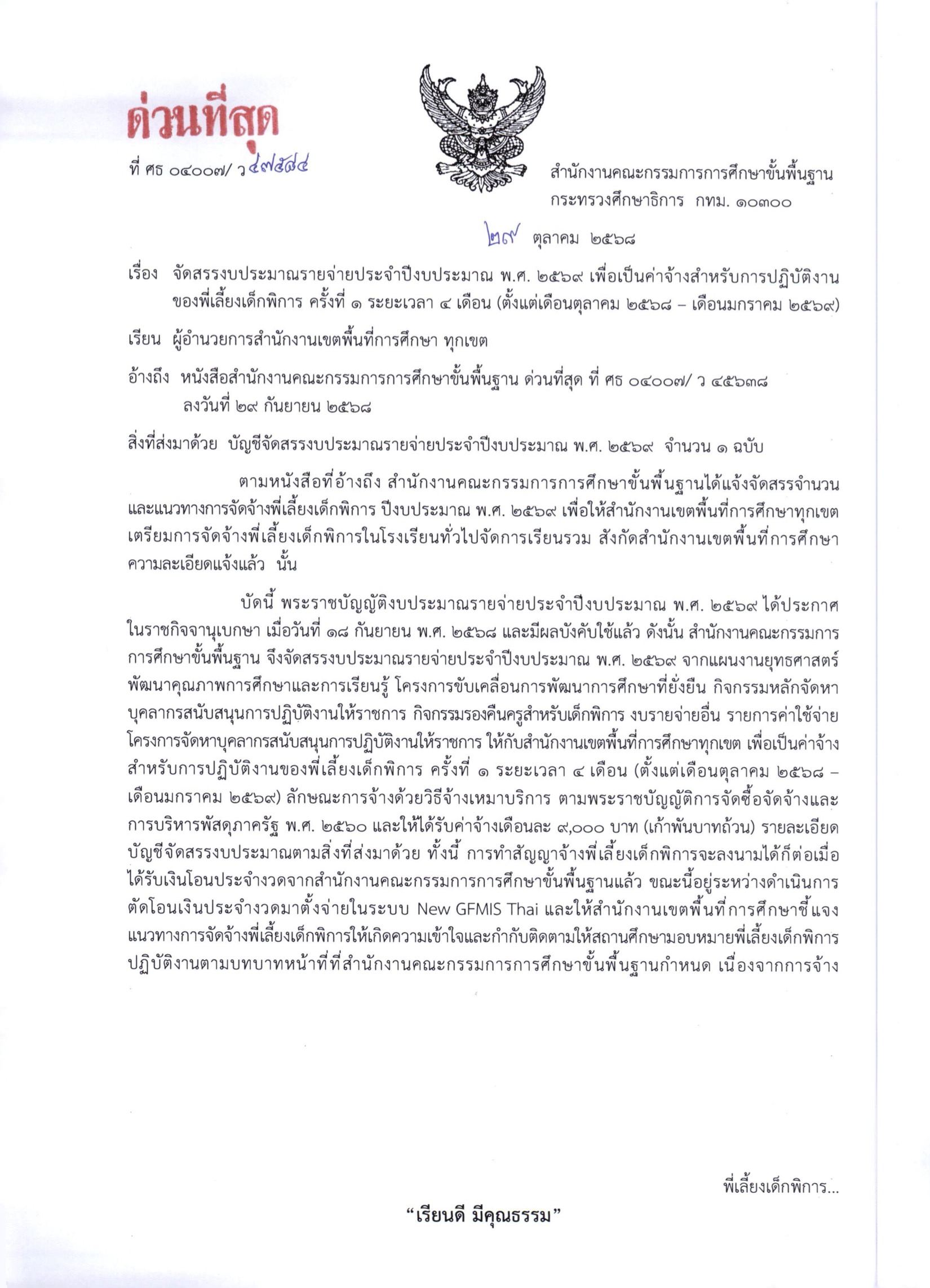 ที่ ศธ 04007/ว 47584 เรื่อง จัดสรรงบประมาณรายจ่ายประจำปีงบประมาณ พ.ศ. 2569 เพื่อเป็นค่าจ้างสำหรับการปฏิบัติงาน ของพี่เลี้ยงเด็กพิการ ครั้งที่ 1 ระยะเวลา 4 เดือน (ตั้งแต่เดือนตุลาคม 2568 – เดือนมกราคม 2569)