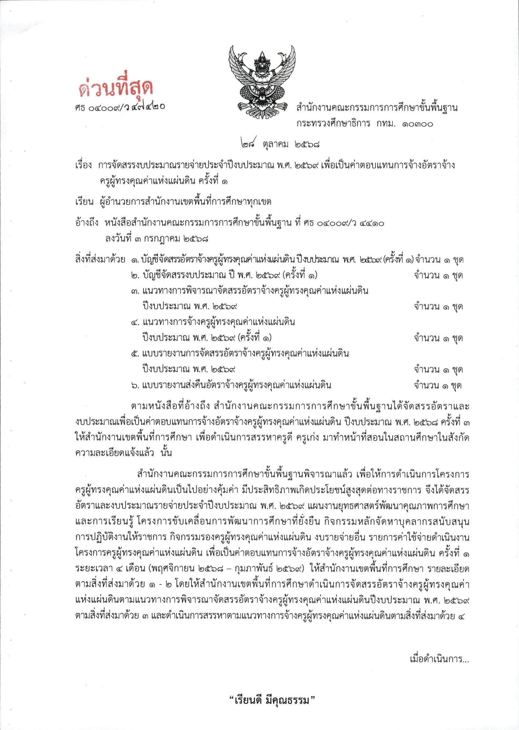 การจัดสรรงบประมาณรายจ่ายประจำปีงบประมาณ พ.ศ. 2569 เพื่อเป็นค่าตอบแทนการจ้างอัตราจ้างครูผู้ทรงคุณค่าแห่งแผ่นดิน ครั้งที่ 1