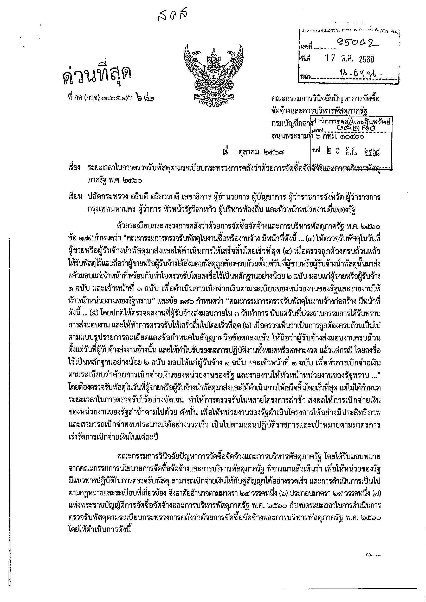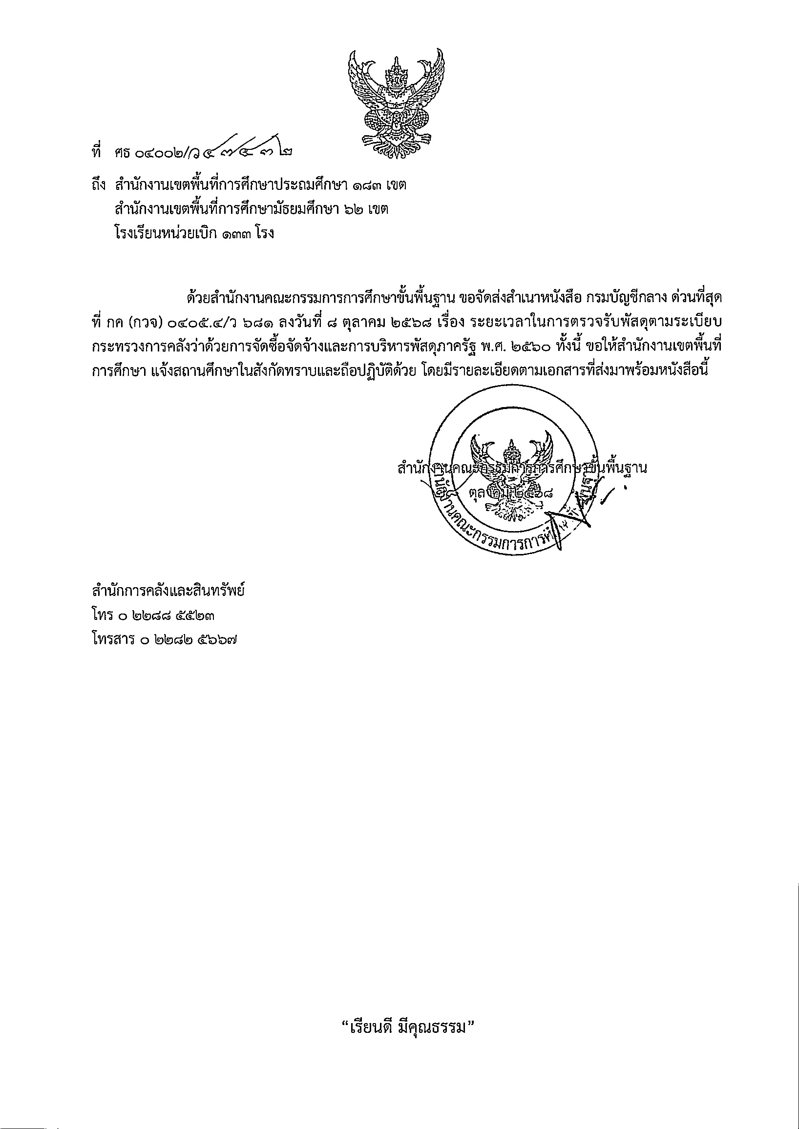 ด้วยสำนักงานคณะกรรมการการศึกษาขั้นพื้นฐาน ขอจัดส่งสำเนาหนังสือ กรมบัญชีกลาง ด่วนที่สุด ที่ กค (กวจ) 0405.4/ว 681 ลงวันที่ 8 ตุลาคม 2568 เรื่อง ระยะเวลาในการตรวจรับพัสดุตามระเบียบ กระทรวงการคลังว่าด้วยการจัดซื้อจัดจ้างและการบริหารพัสดุภาครัฐ พ.ศ. 2560 ทั้งนี้ ขอให้สำนักงานเขตพื้นที่การศึกษา แจ้งสถานศึกษาในสังกัดทราบและถือปฏิบัติด้วย โดยมีรายละเอียดตามเอกสารที่ส่งมาพร้อมหนังสือนี้