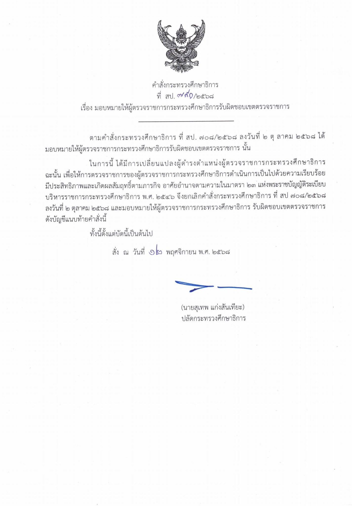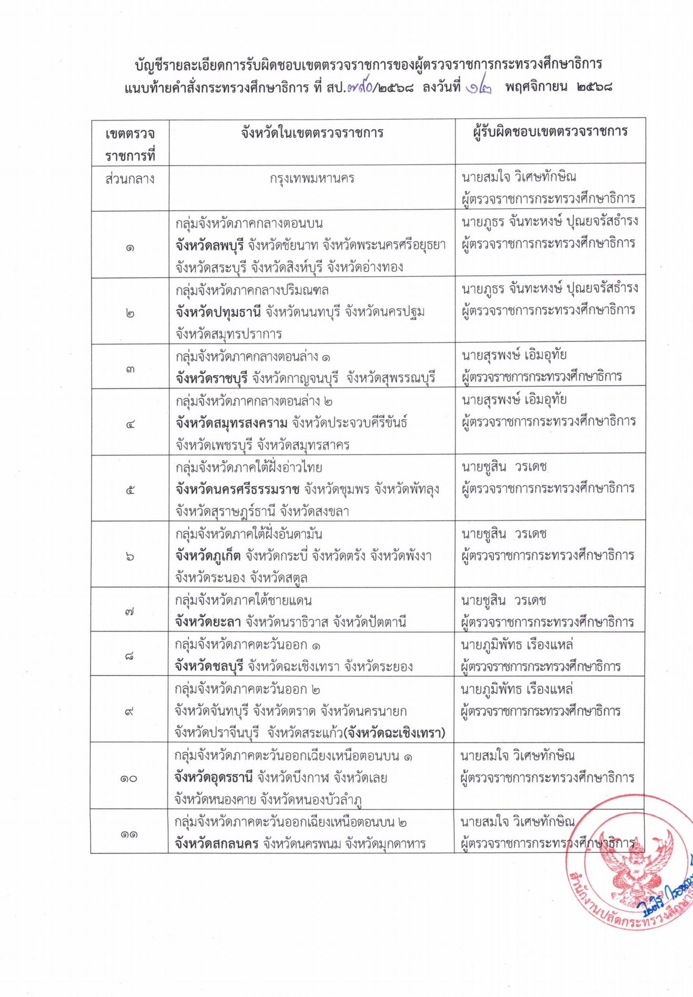 เมื่อวันที่ 12 พฤศจิกายน 2568 นายสุเทพ แก่งสันเทียะ ปลัดกระทรวงศึกษาธิการ ได้ลงนามในคำสั่งกระทรวงศึกษาธิการ ที่ 790/2568 เรื่อง มอบหมายให้ผู้ตรวจราชการกระทรวงศึกษาธิการรับผิดชอบเขตตรวจราชการ รายละเอียด ดังนี้