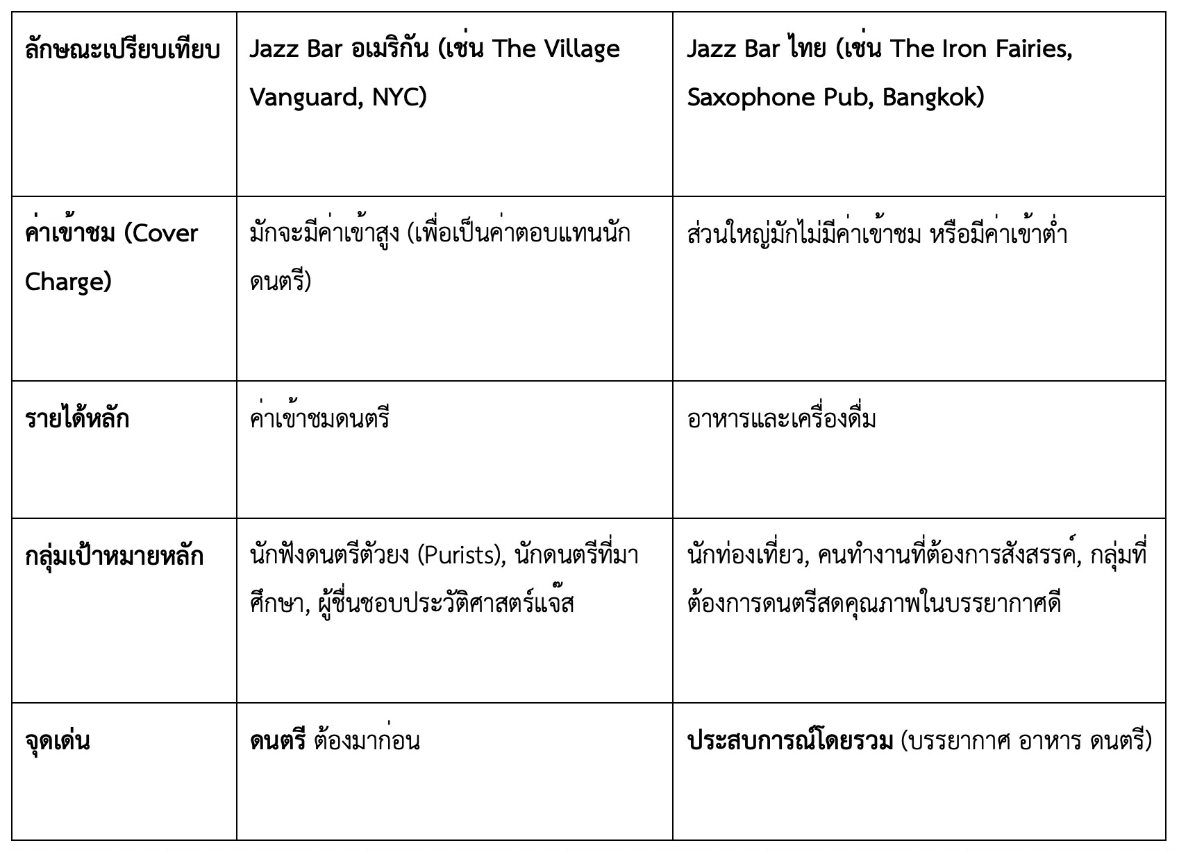 ความแตกต่างทางวัฒนธรรมมีผลอย่างมากต่อบรรยากาศและจุดประสงค์หลักของ Jazz Bar ในแต่ละที่