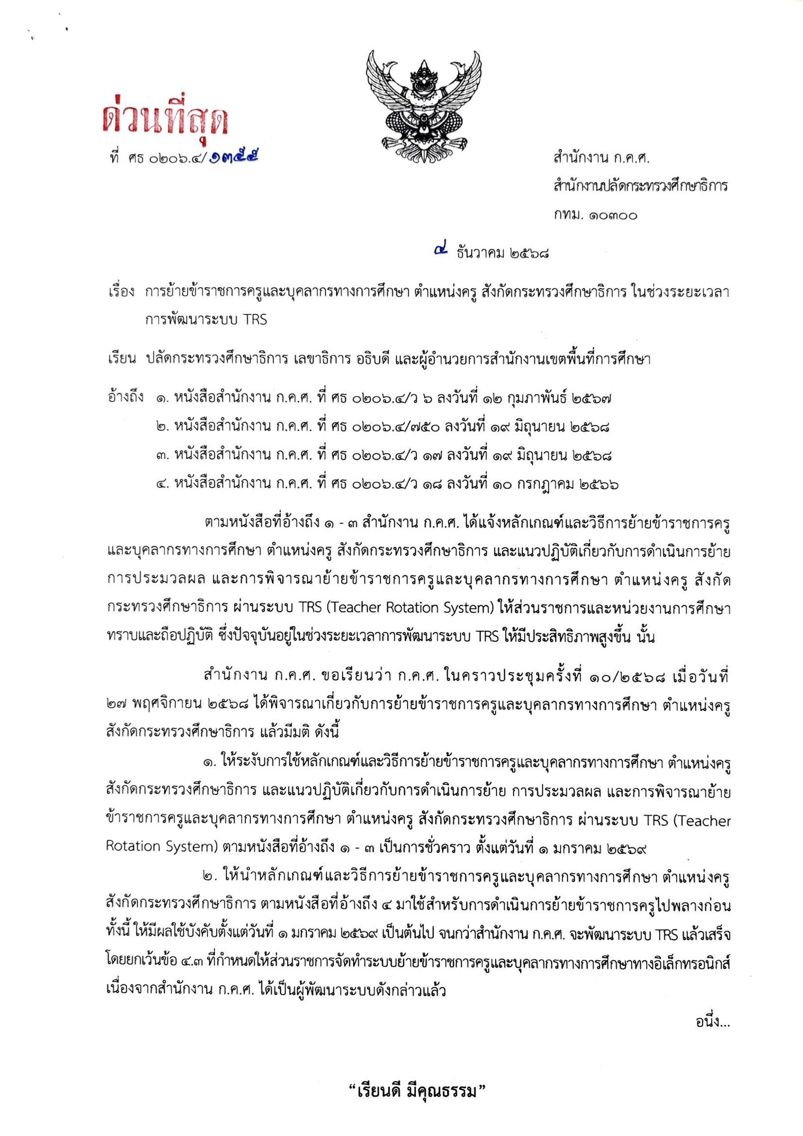 ด่วนที่สุด ล 1355/2568 การย้ายข้าราชการครู และบุคลากรทางการศึกษา ตำแหน่งครู สังกัดกระทรวงศึกษาธิการ ในช่วงระยะเวลาการพัฒนาระบบ TRS