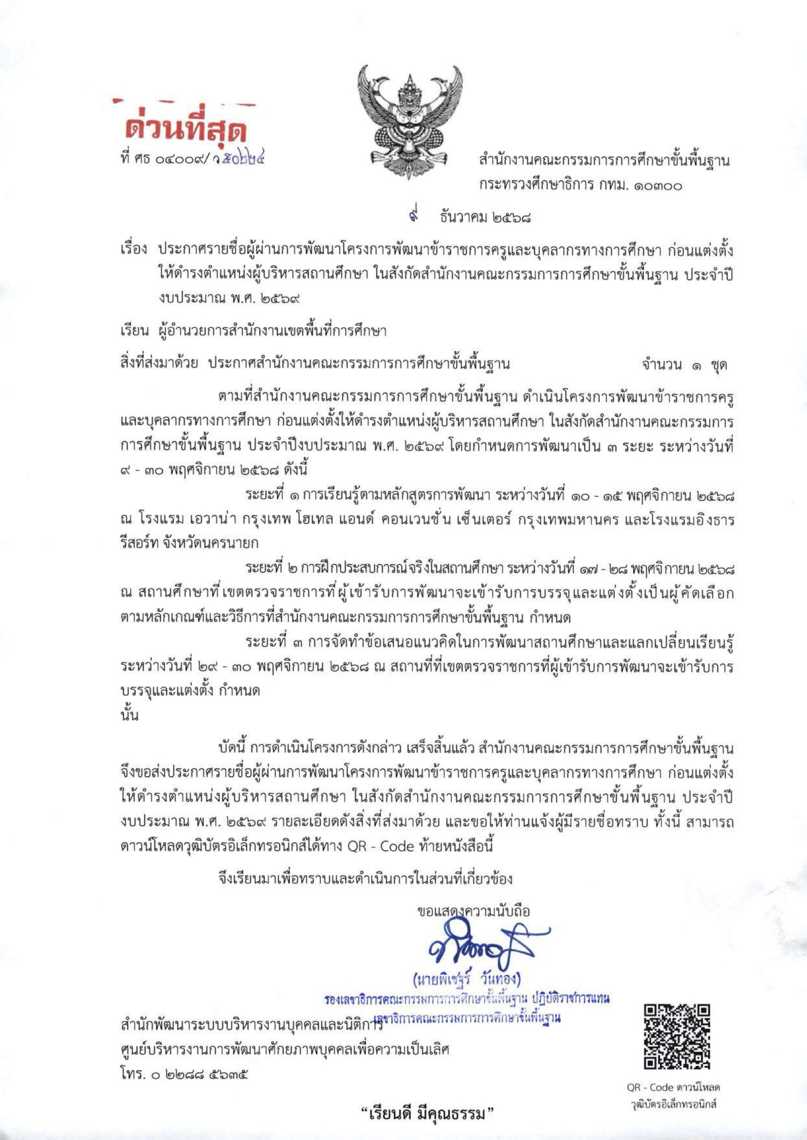 สพฐ.ประกาศรายชื่อผู้ผ่านการพัฒนาโครงการพัฒนาข้าราชการครูและบุคลากรทางการศึกษา ตำแหน่งผู้บริหารสถานศึกษา ประจำปีงบประมาณ พ.ศ.2569