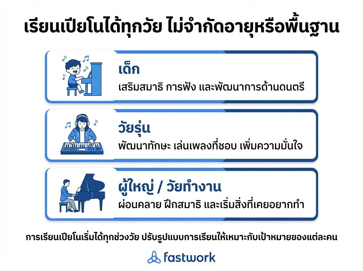 การเรียนเปียโนสามารถปรับให้เหมาะกับผู้เรียนในแต่ละช่วงวัยได้อย่างยืดหยุ่น และในสำหรับเด็กการเรียนเปียโนช่วยเสริมพัฒนาการด้านสมาธิการฟังและการเรียนรู้ดนตรีพื้นฐานผ่านกิจกรรมที่สนุกและเหมาะกับวัย ในช่วงวัยรุ่นอาจเลือกเรียนเพื่อพัฒนาทักษะให้ลึกขึ้นเล่นเพลงที่ชอบหรือใช้เป็นกิจกรรมสร้างสมดุลระหว่างการเรียนกับเวลาส่วนตัว ในขณะที่ผู้ใหญ่จำนวนมากเริ่มเรียนเปียโนเพื่อผ่อนคลาย ฝึกสมาธิหรือทำให้ความสนใจที่เคยอยากทำแต่ยังไม่มีโอกาส