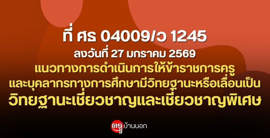 ที่ ศธ 04009/ว 1245 ลงวันที่ 27 มกราคม 2569 เรื่อง แนวทางการดำเนินการให้ข้าราชการครูและบุคลากรทางการศึกษามีวิทยฐานะหรือเลื่อนเป็นวิทยฐานะเชี่ยวชาญและเลื่อนเป็นวิทยฐานะเชี่ยวชาญพิเศษ