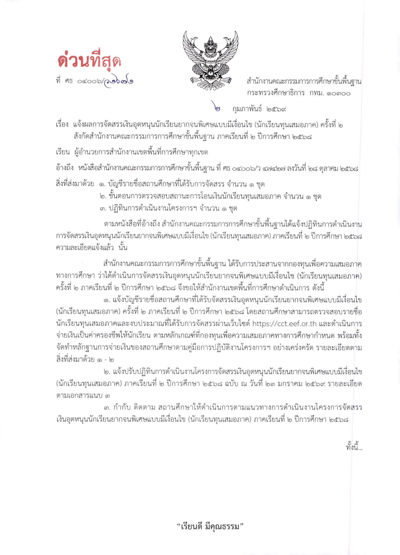 แจ้งผลการจัดสรรเงินอุดหนุนนักเรียนยากจนพิเศษแบบมีเงื่อนไข (นักเรียนทุนเสมอภาค) ครั้งที่ 2 สังกัด สพฐ. ภาคเรียนที่ 2 ปีการศึกษา 2568